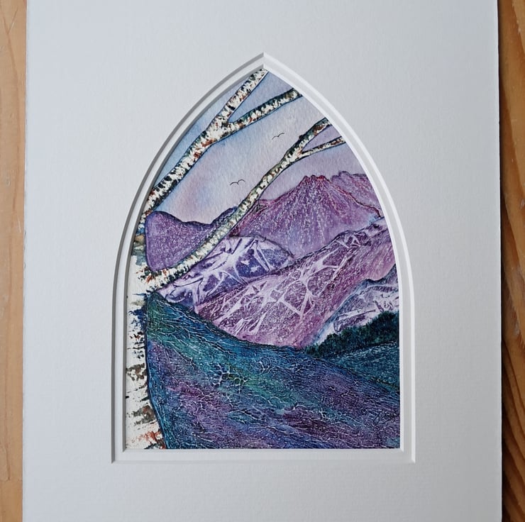 Echoes of Peace is an original framed painting which was triggered by music. An imaginative dreamscape in a double antique white arch mount.