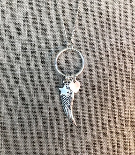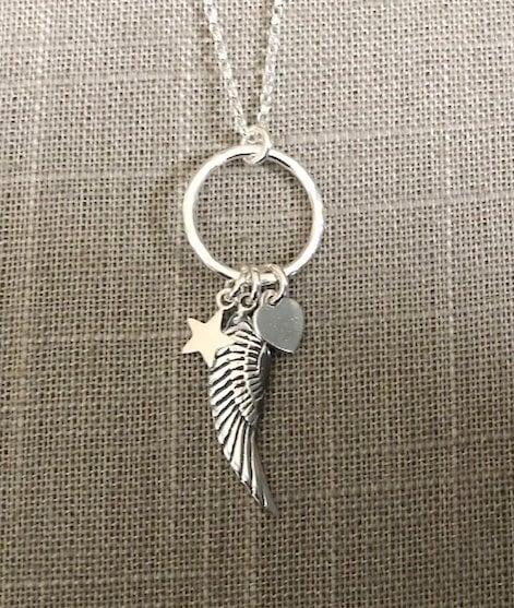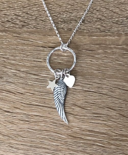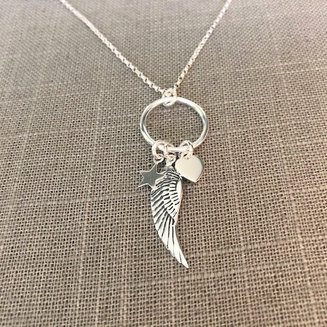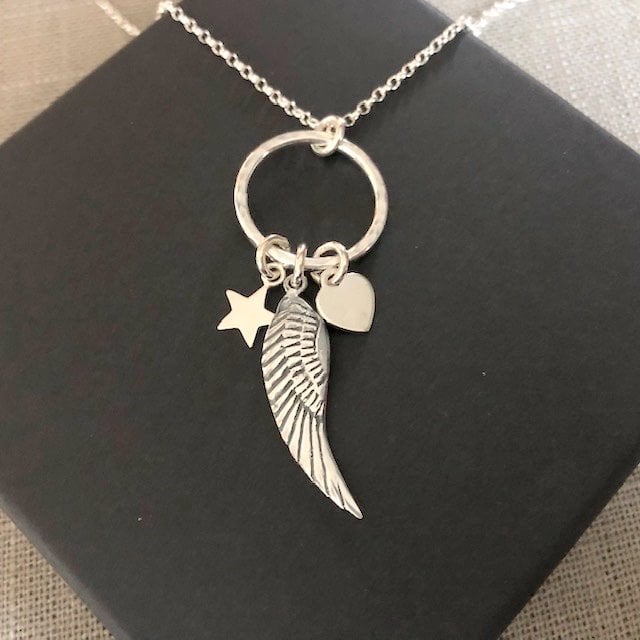 Sterling Silver Circle and Angel Wing Pendant with Heart and Star charm. I made the necklace from .925 Sterling Silver, formed the circle and textured with a jewellers hammer. The angel wing pendant, star and heart charm hang from the bottom of the circle and move freely. The pendant hangs from a Sterling Silver belcher rolo chain secured with a bolt ring clasp.