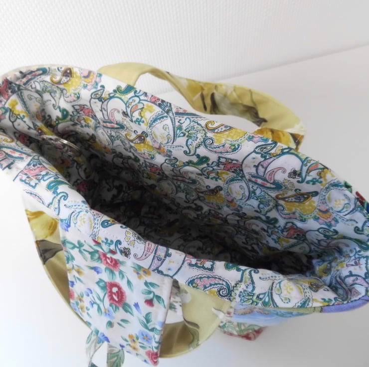It has a flap at the top and fastens with a loop around a large button covered with vintage embroidery. Bag measures 30cm across the top and 25cm high. The base has been boxed and is 10cm deep. It has short handles which measure 33cm and are made from strong furnishing fabric.
