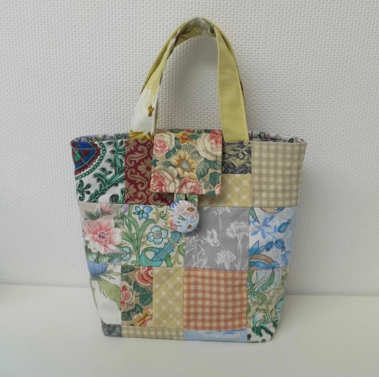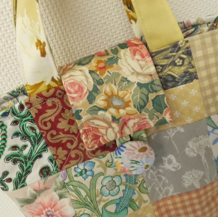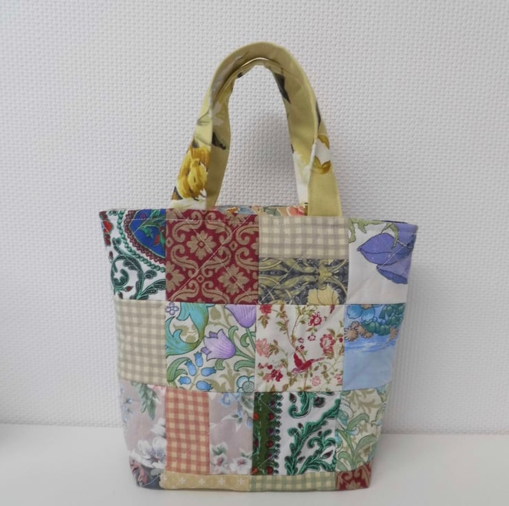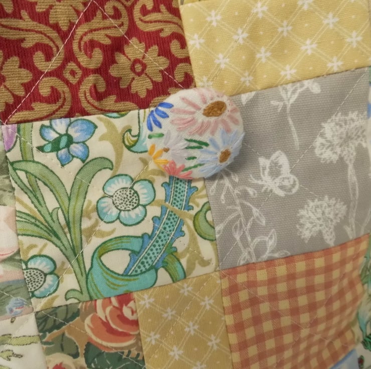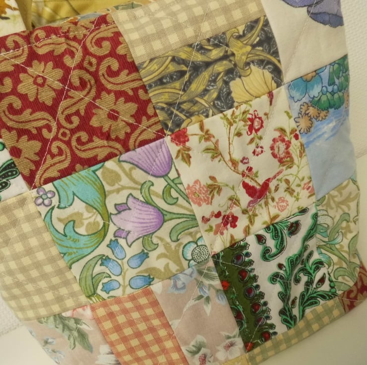 I pieced together lots of fabric offcuts into patchwork squares to make this bag, it was lengthy work but the result is very pretty! I then machine quilted it with diagonal rows onto a layer of wool to give the bag some body and maintain its shape. Lined with a beautiful modern paisley print cotton. I stitched a ring into one of the inside seams which can be used to attach keys etc.