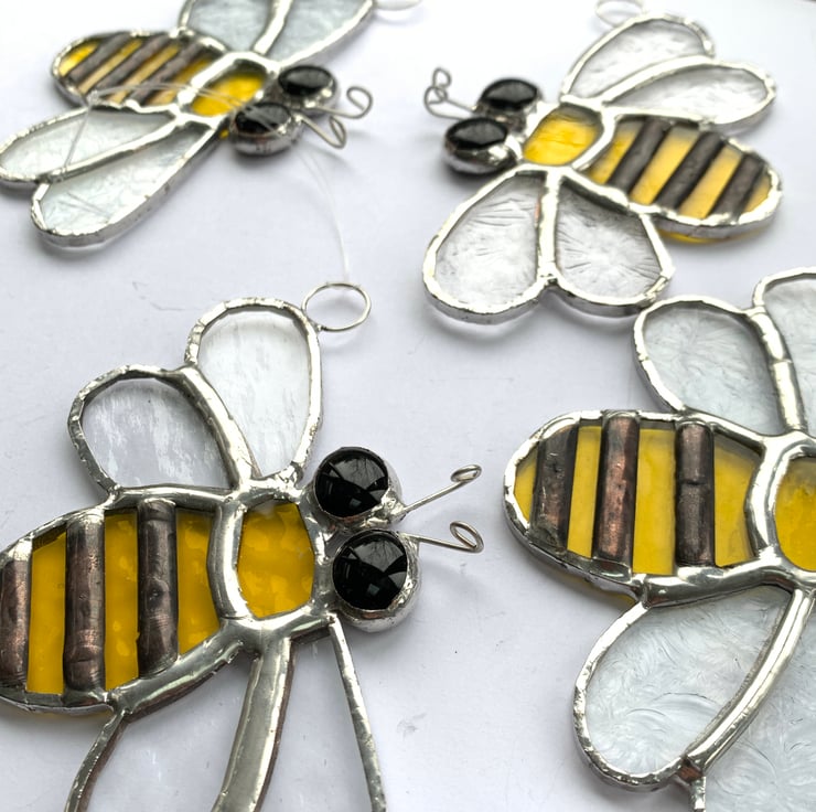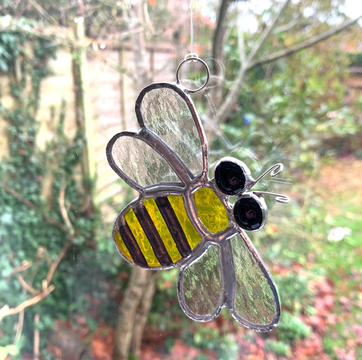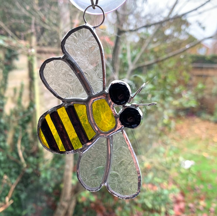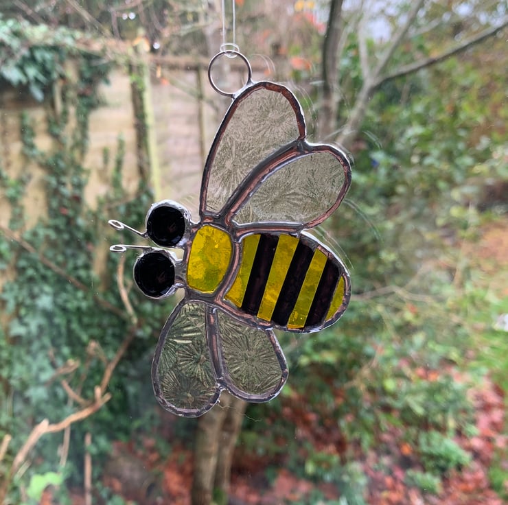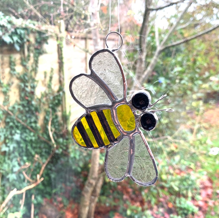 This suncatcher has made by cutting the glass by hand, grinding each piece to remove any sharp edges, foiling with copper foil, soldering and then washing. A patina has been applied to the stripes to blacken them. The glass used for this bee is vibrant glass for the body and clear textured glass for the wings.