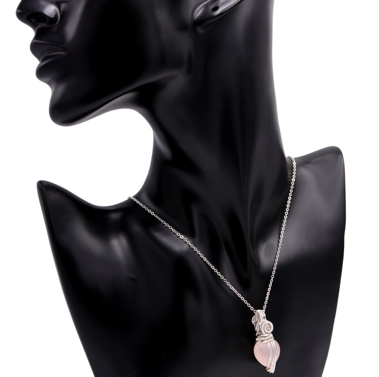 At the centre of the pendant is a heart shaped rose quartz gem stone.