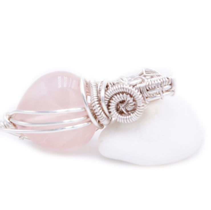 At the centre of the pendant is a heart shaped rose quartz gem stone.