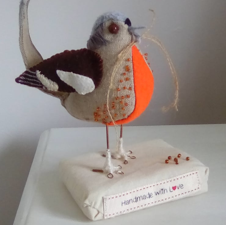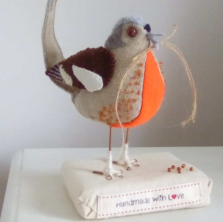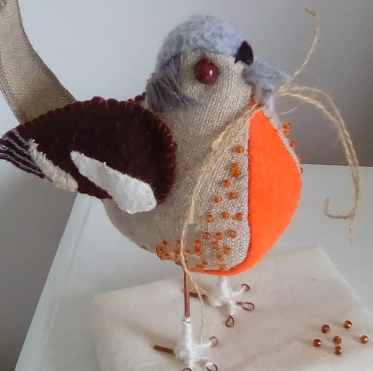 I have made this one from linen and wool felt. I have embroidered the head with embroidery cotton and it has tiny Orange beads on it's breast. The legs are of copper and the feet have been wrapped in Cream yarn. It has beaded eyes and stands 12cms tall and is 15cms from its beak to the end of its tail.