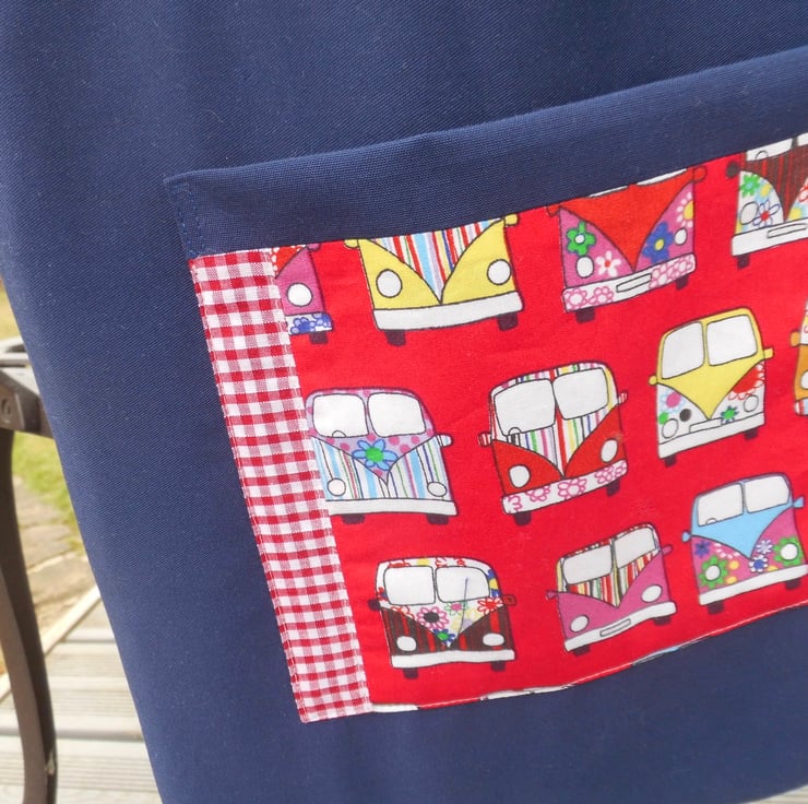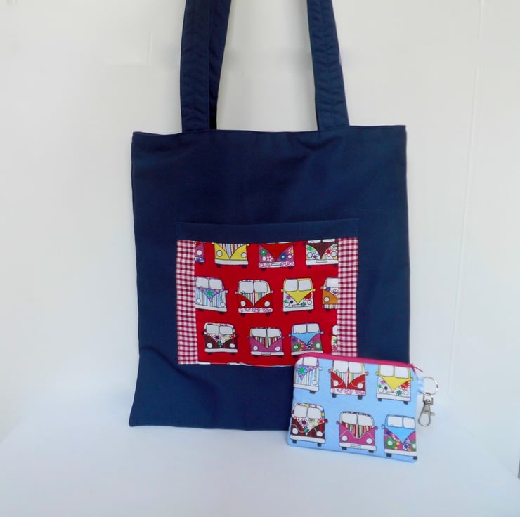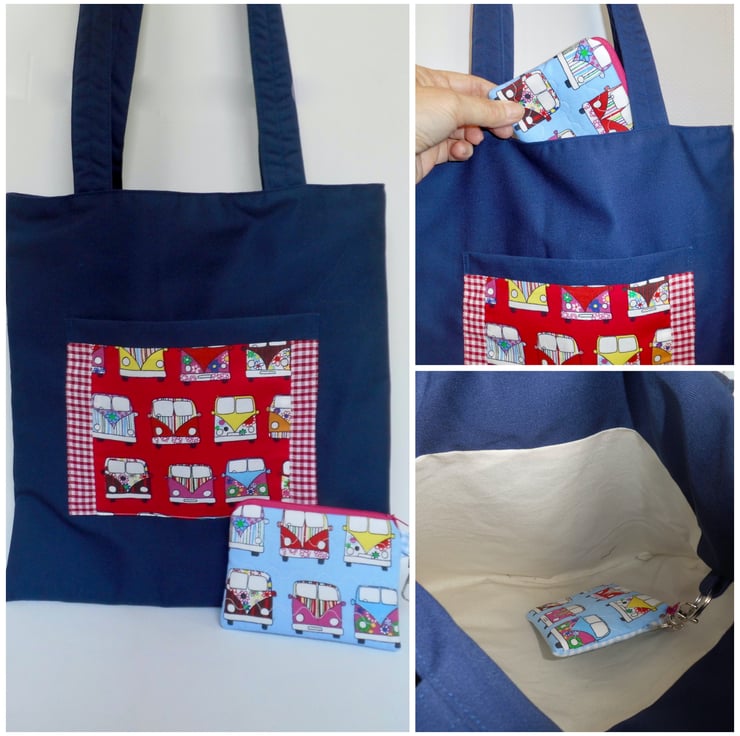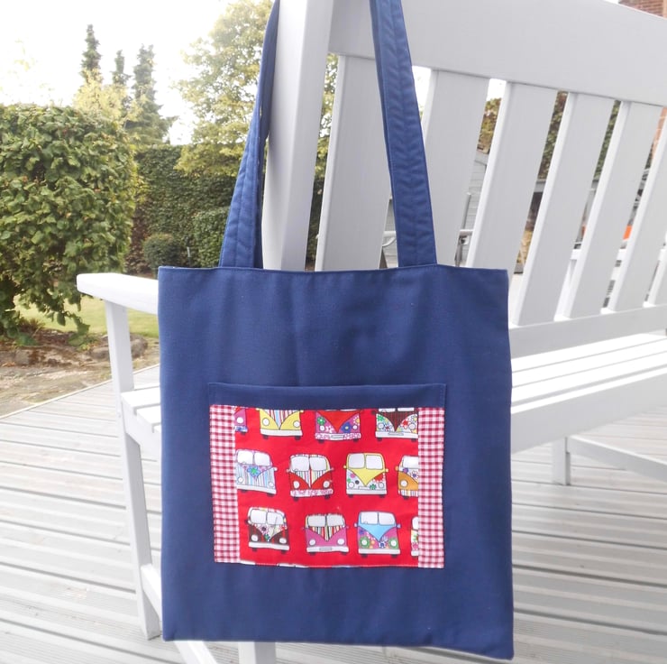 A fun tote bag made using a medium weight fabric in navy blue. It is faced at the top with the same fabric for a professional finish and then the lower half is lined with natural calico. I have inserted a key ring in one of the side seams, and there are no raw edges inside. There's a slip pocket on the front, in red cotton fabric printed with colourful little retro camper vans, edged with red and white gingham.