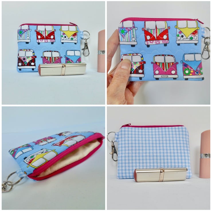 This bag comes with a little coin purse made in blue camper van fabric, with blue gingham on the reverse. Both these fabrics were backed with fusible fleece and then machined with three lines of wave stitch. It has a bright pink zip across the top and can be clipped inside the tote using the clasp provided. It measures about 13cm x 9cm.