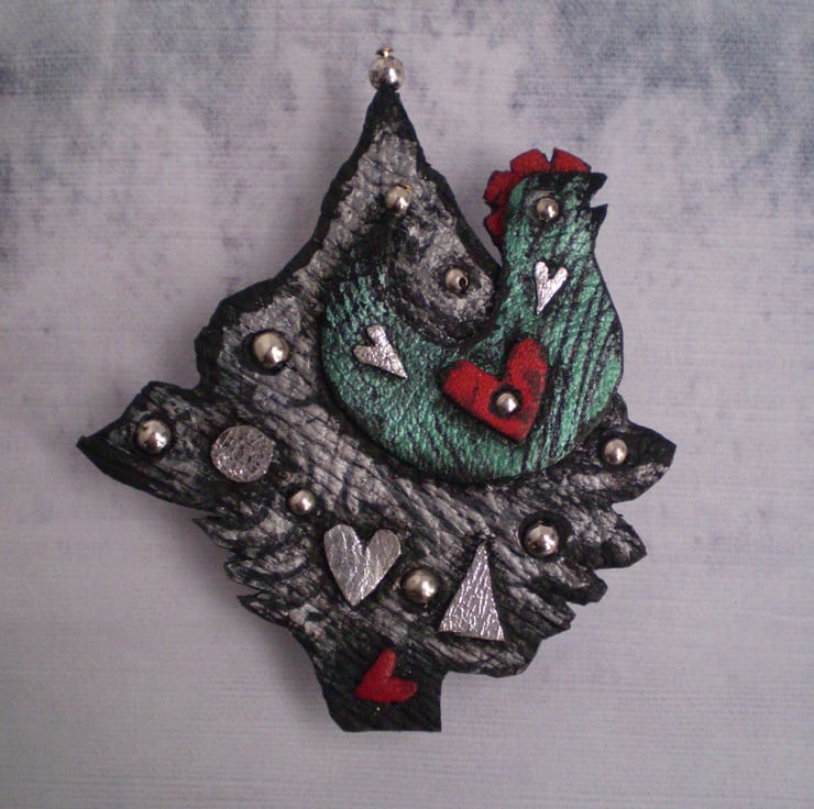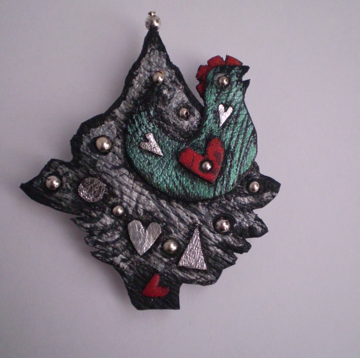 Decorated with a singing bird and hand cut silver leather hearts.