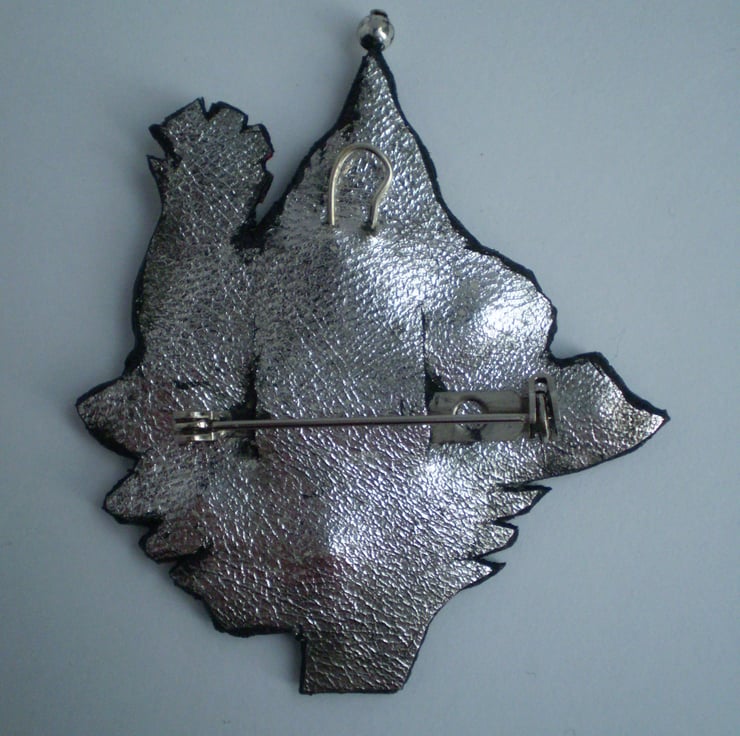 Made from recycled leather hand painted with metalic acrylic paints.