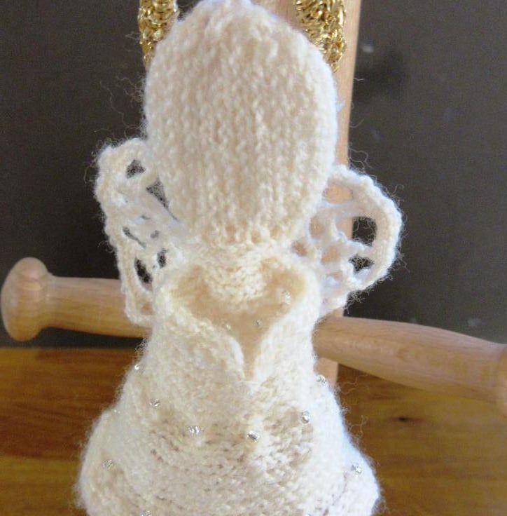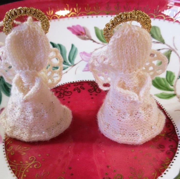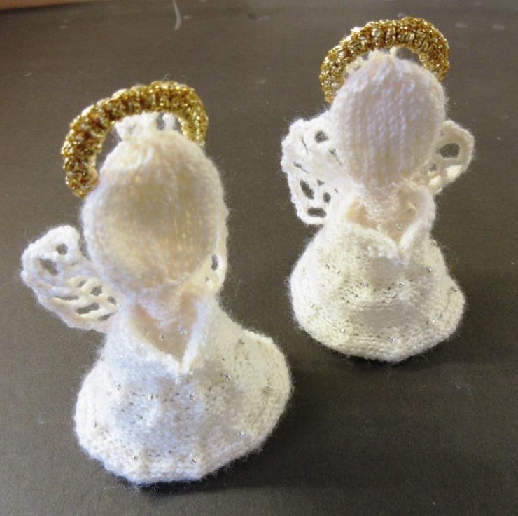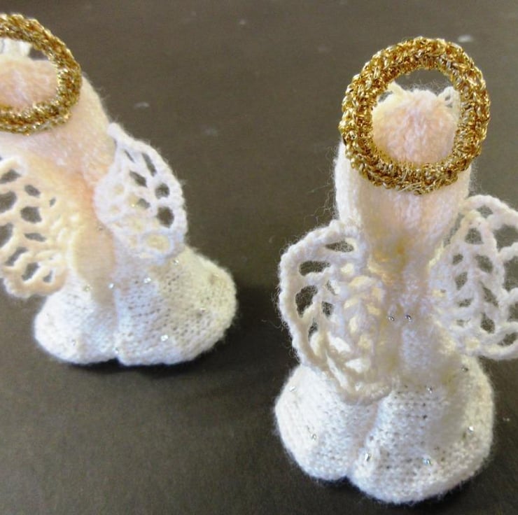 Two hand-knitted angel Christmas tree ornaments. The angels are hand-knitted in 2-ply baby wool in very pale pink with sparkly seed beads knitted into their skirts, lacy crocheted wings and gold crocheted haloes. They will either stand independently or can be hung on the Christmas tree with the attached crocheted hanging loop. Each angel is approximately 3.5"/9 cm tall.