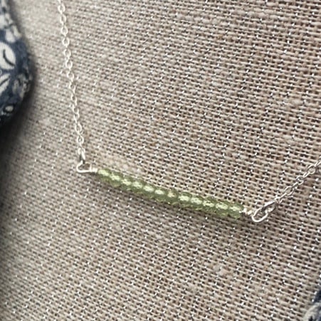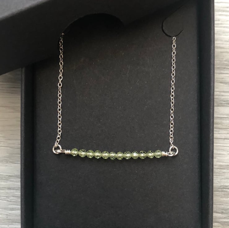 Tiny 2 mm faceted peridot beads have been hand wired onto sterling silver wire and added to a sterling silver trace chain.