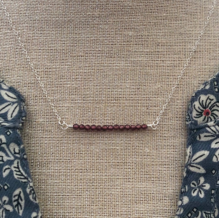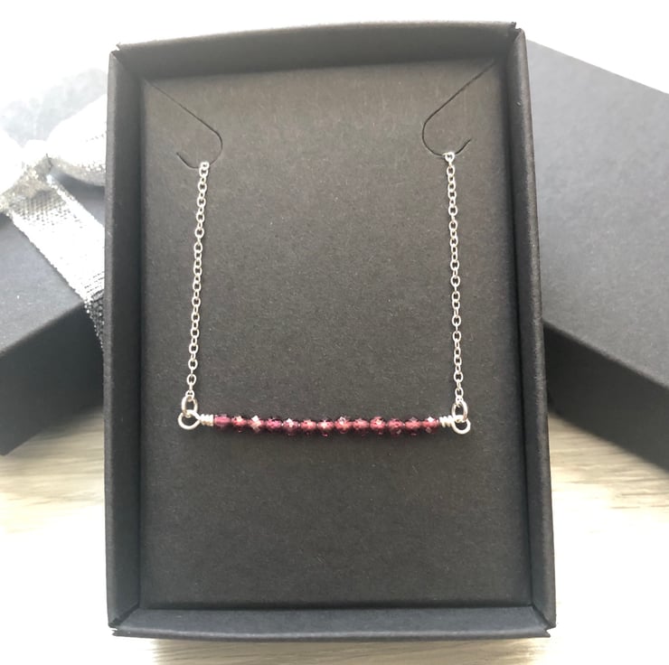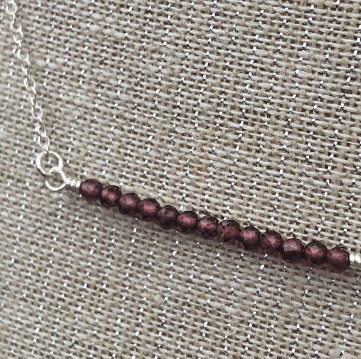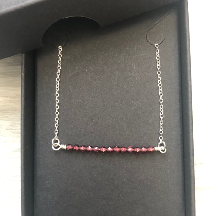 Tiny 2 mm faceted garnet beads have been hand wired onto sterling silver wire and added to a sterling silver trace chain.