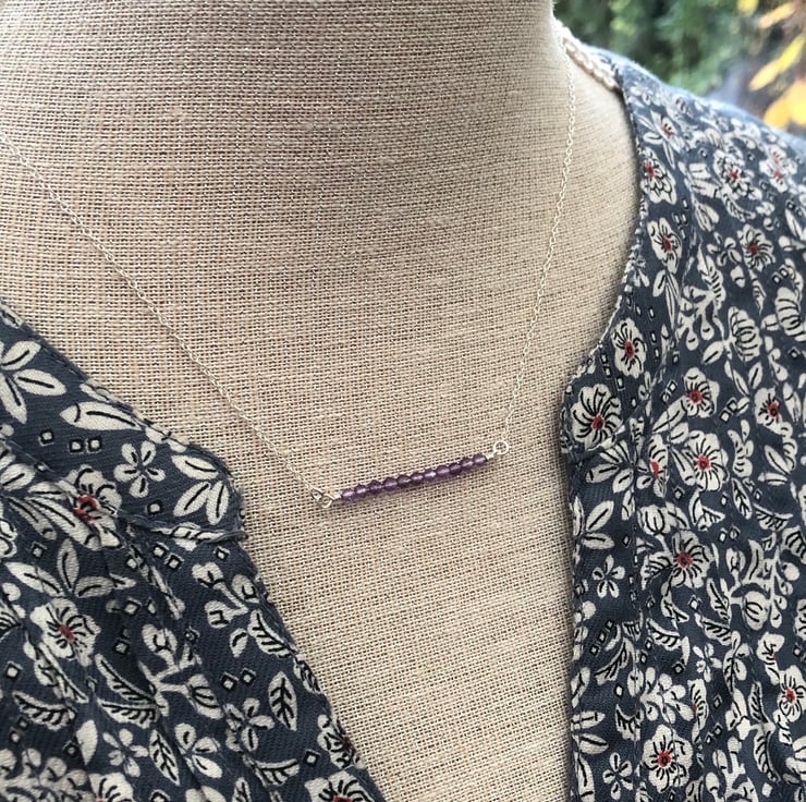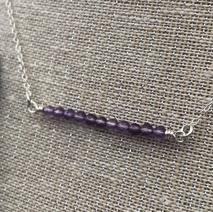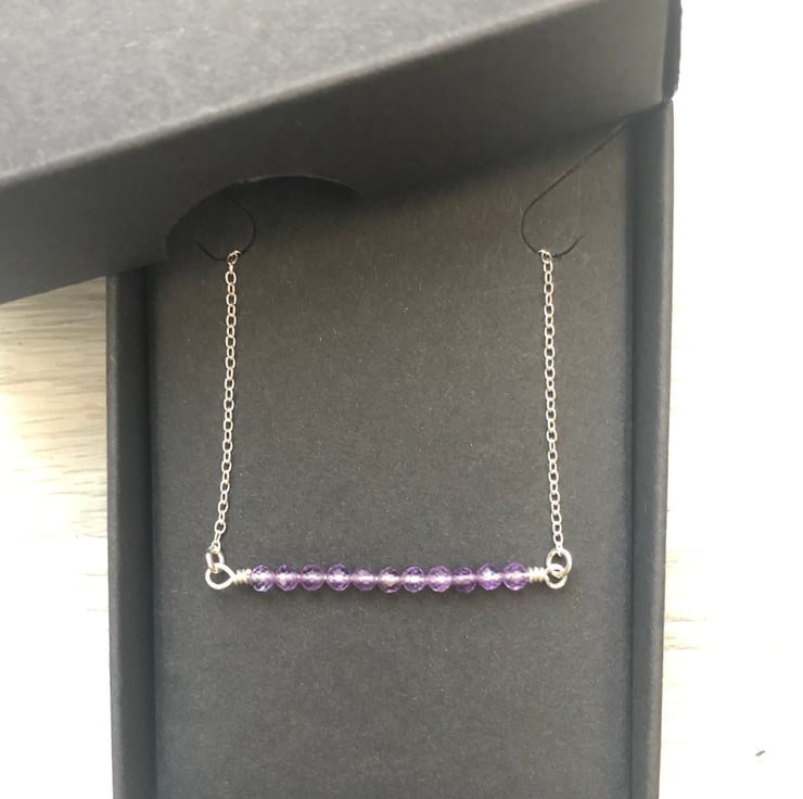 Tiny 2 mm faceted amethyst beads have been hand wired onto sterling silver wire and added to a sterling silver trace chain.