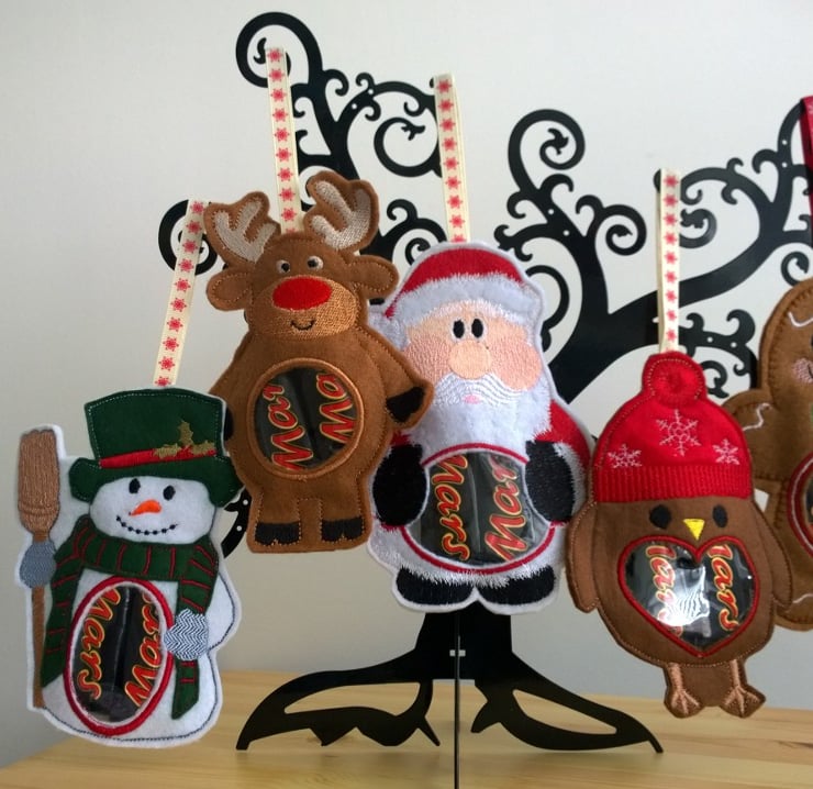 Hanging Snowman treat bag. Big enough to hold the treat size sweets, he stands about 7 inches tall not including the hanging ribbon.
