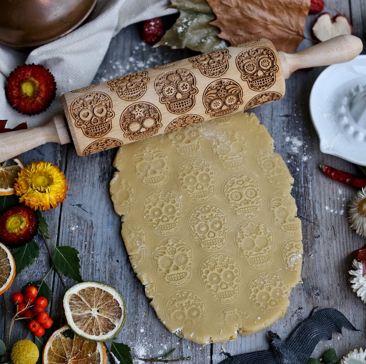 Gorgeous rolling pin featuring a repeating Sugar Skull pattern, perfect for Halloween or any day of the dead you fancy!