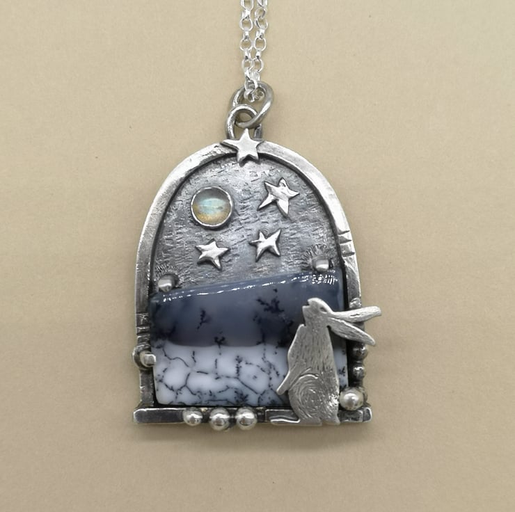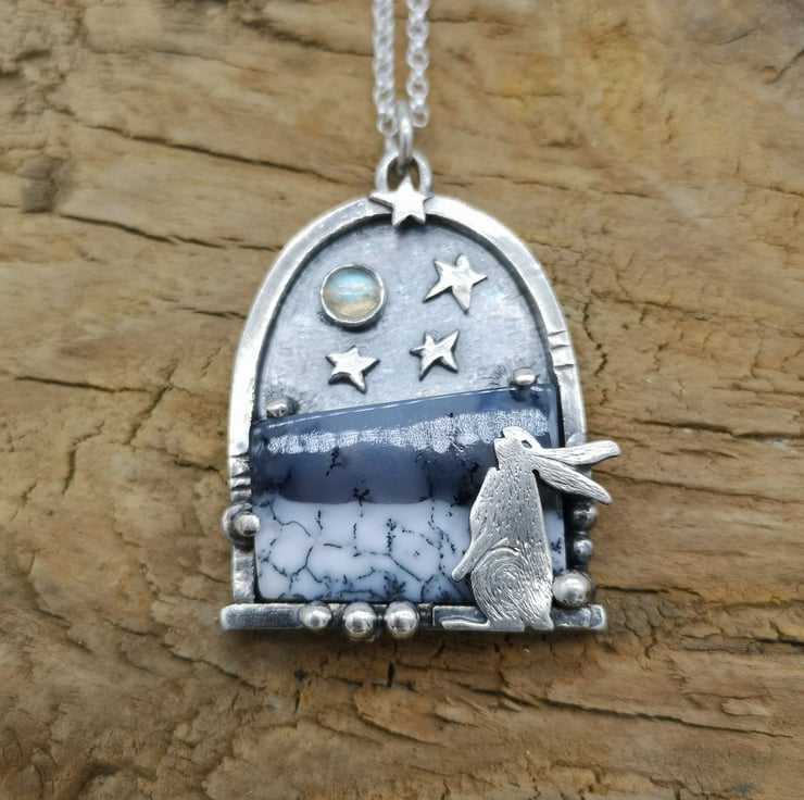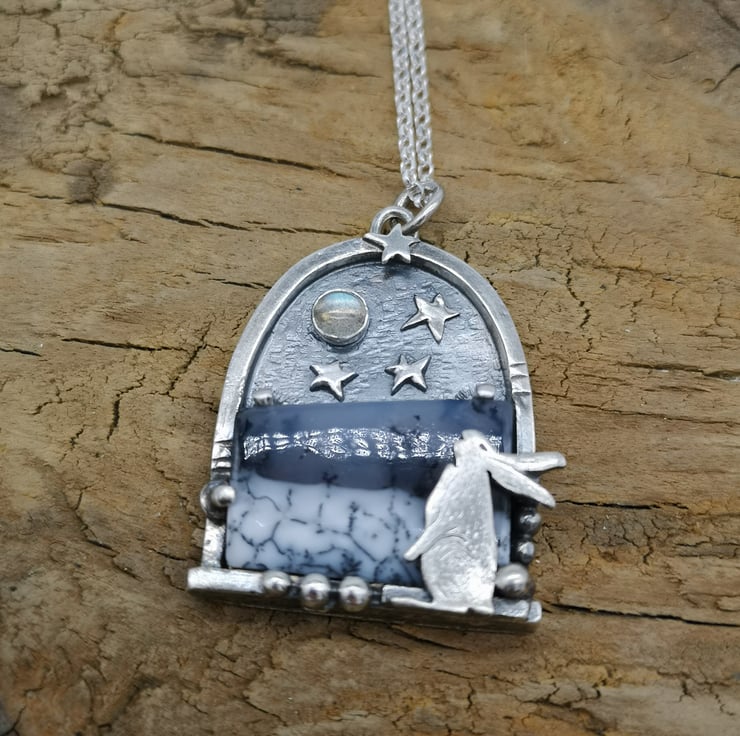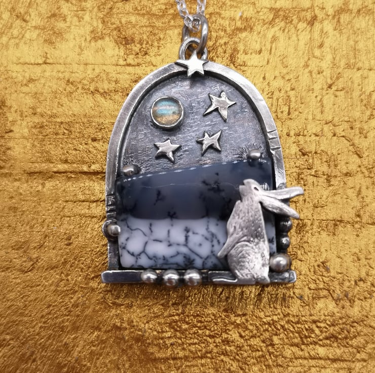 Dendritic opals are one of my favourite stones, created by nature and each one unique, they embrace the beauty of winter. I have used this one to create a little picture with a hare gazing up into a moonlit starry sky.