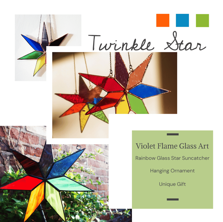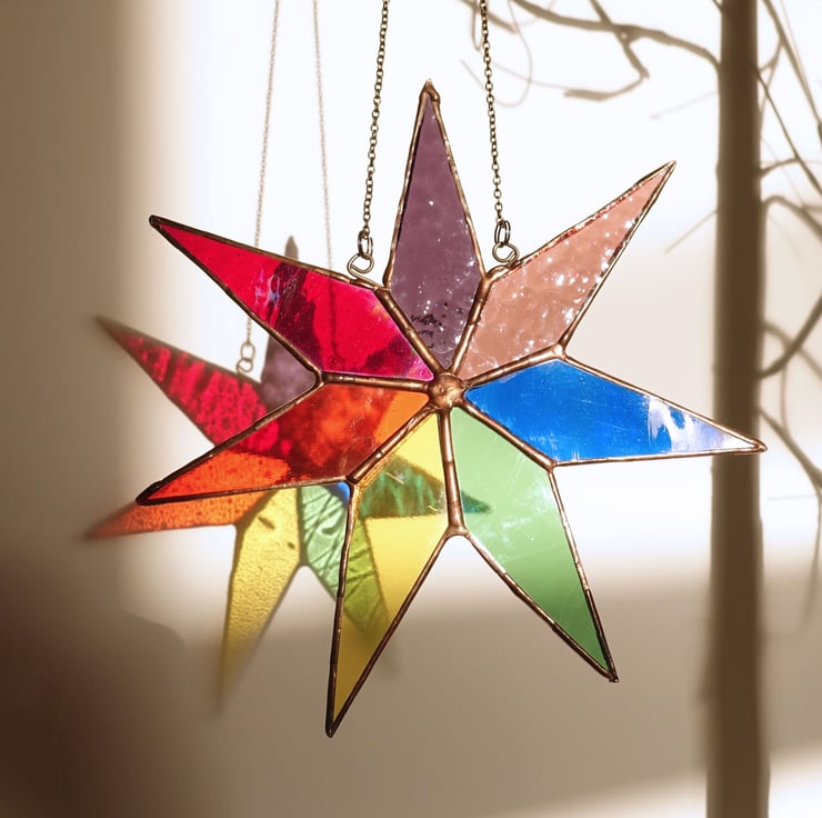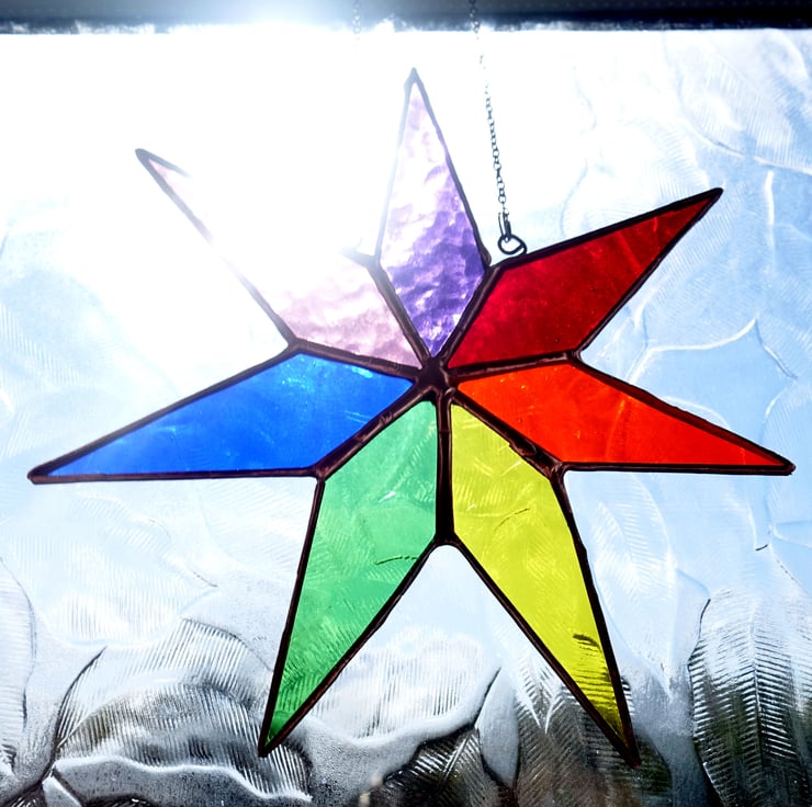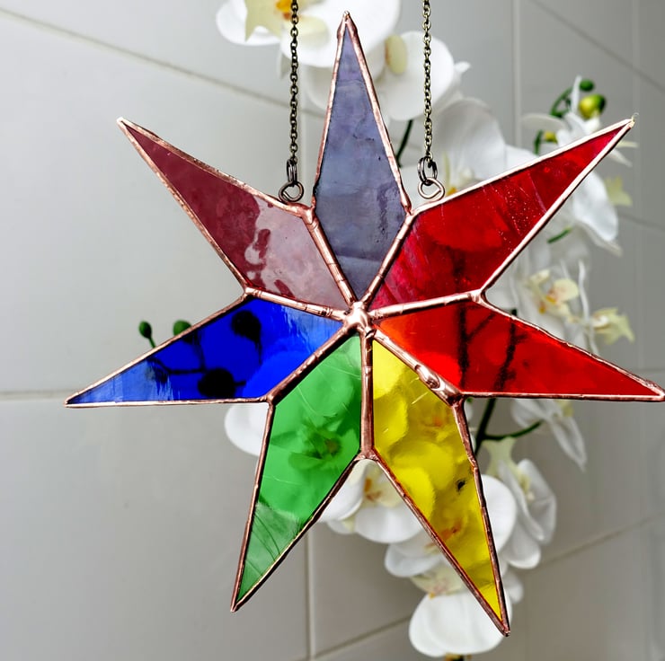 A pretty star made from seven colours of the rainbow. It measures approx 5 to 6 inches and hangs from an antique bronze chain.