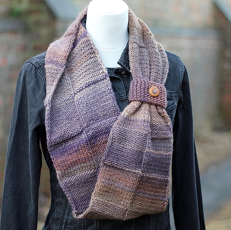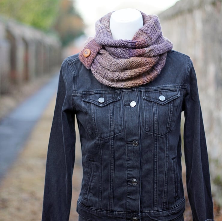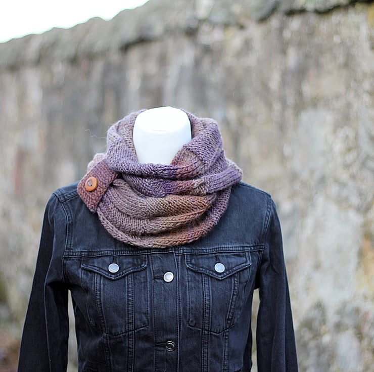 This infinity scarf is hand knit out of super soft self patterning wool and acrylic blend yarn.