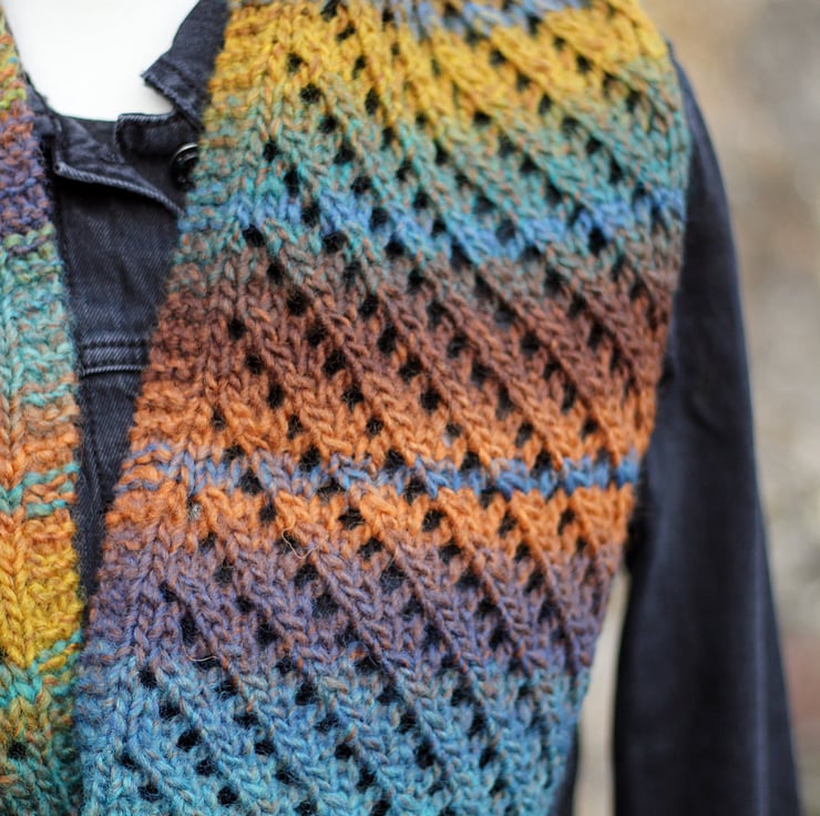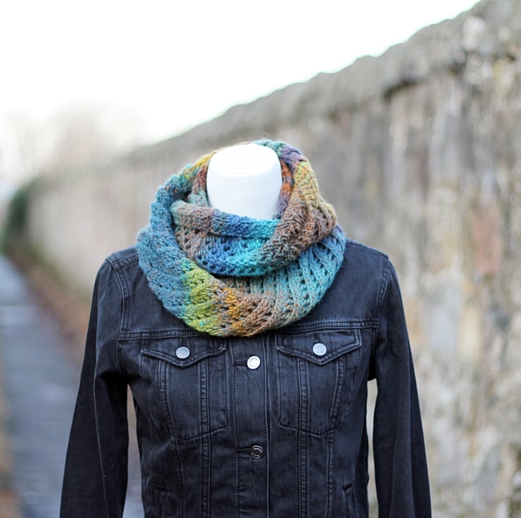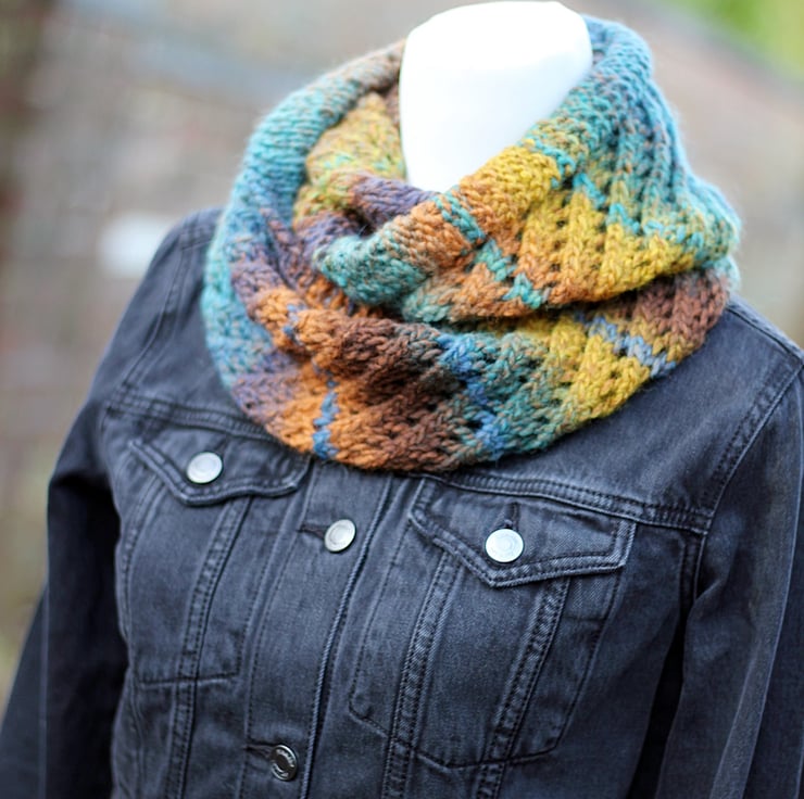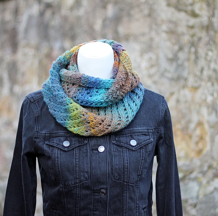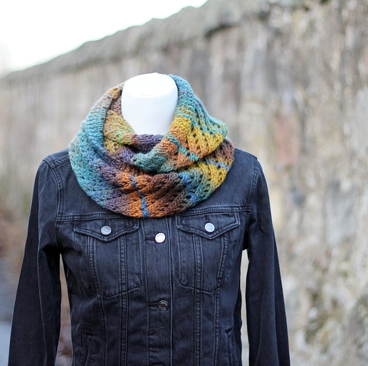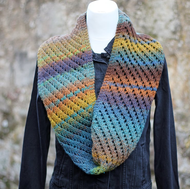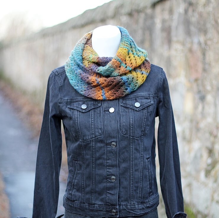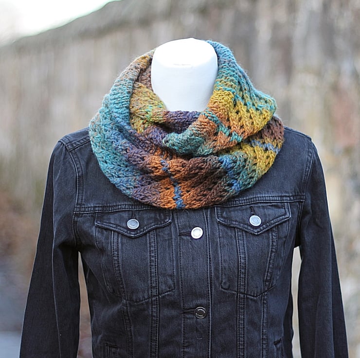 This colourful infinity scarf is hand knit out of super-soft variegated yarn.
