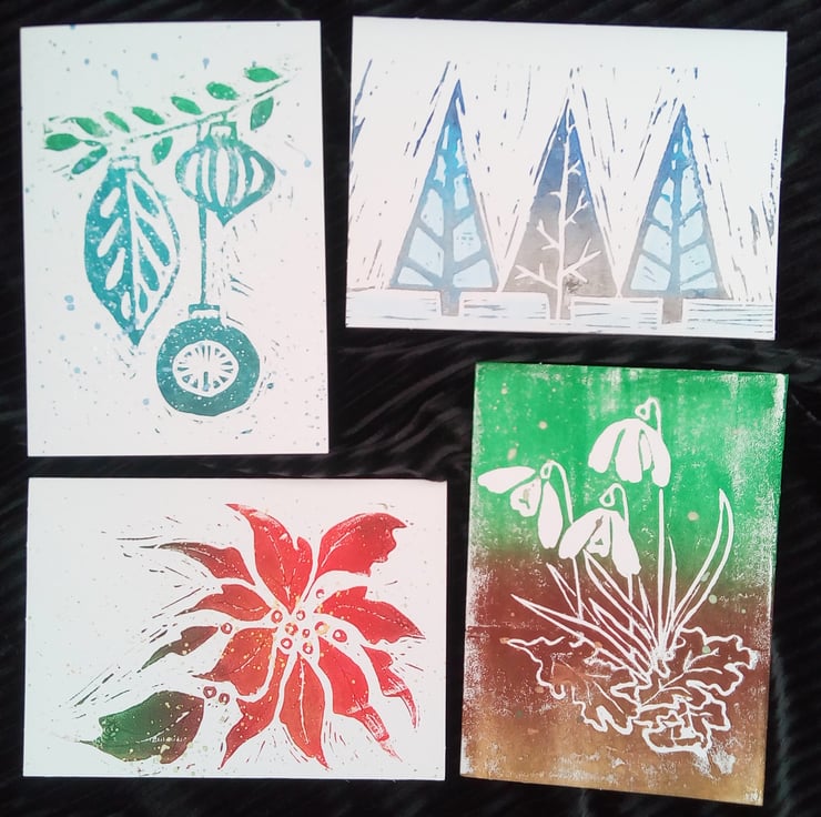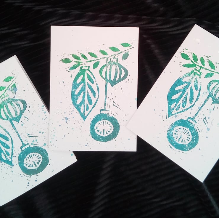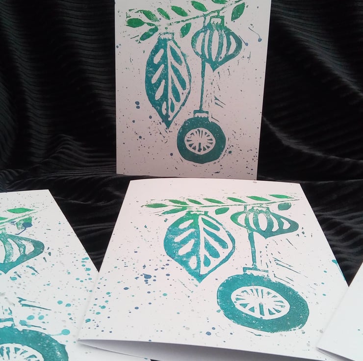 Hand printed lino cut Christmas card in a vintage bauble inspired design.