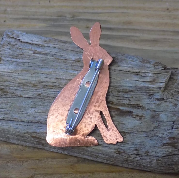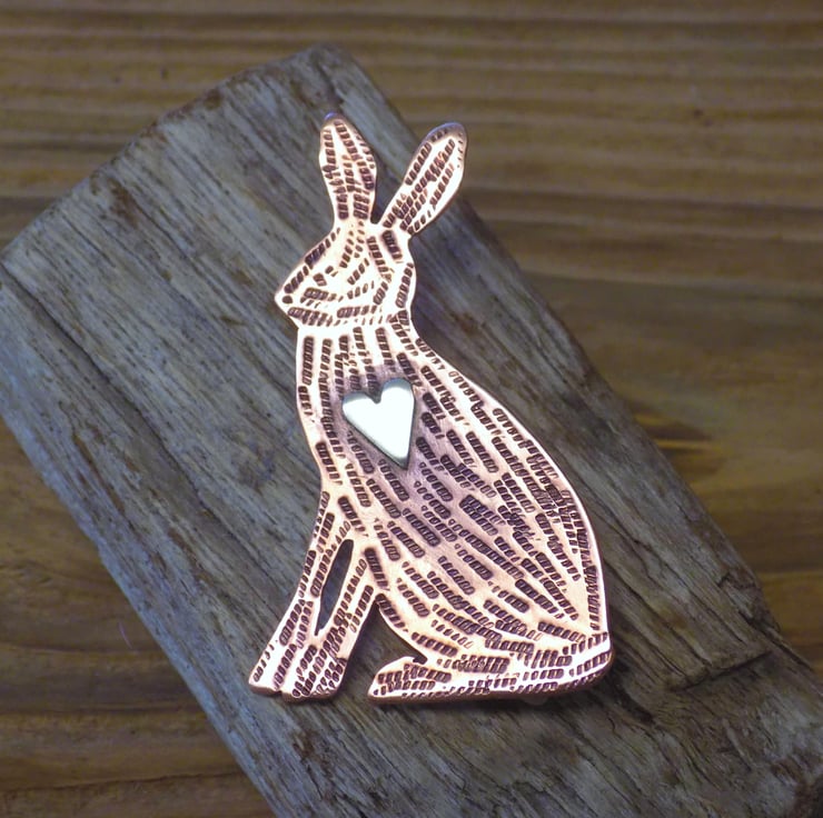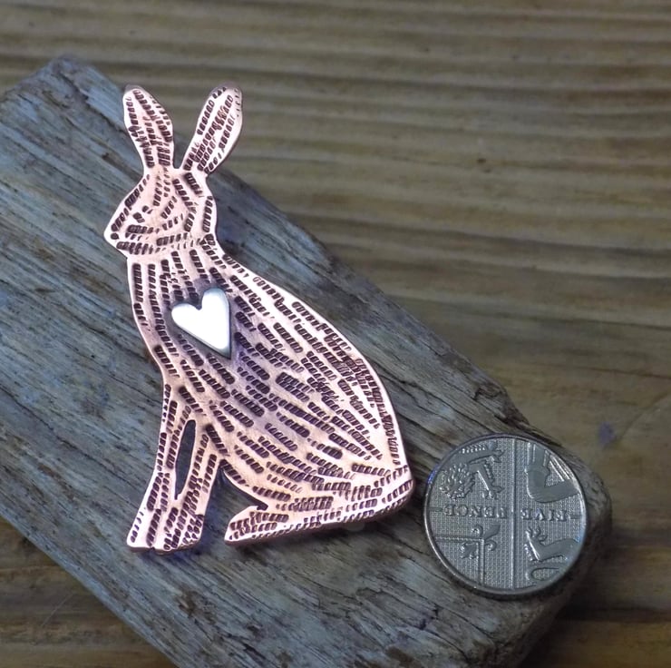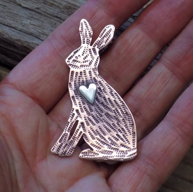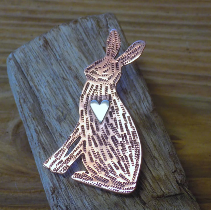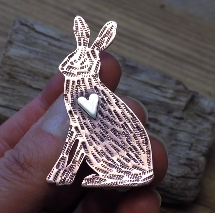 Designed and hand sawn from 1mm thick copper sheet. Each textured stroke has been stamped onto the copper to create the hares coat and a sterling silver heart has been soldered to the front. The whole pendant has been given an aged effect which picks out all the detail and texture creating a lovely contrast between the silver and copper. A sturdy brooch setting has been fixed to the back with very strong jewellers glue.