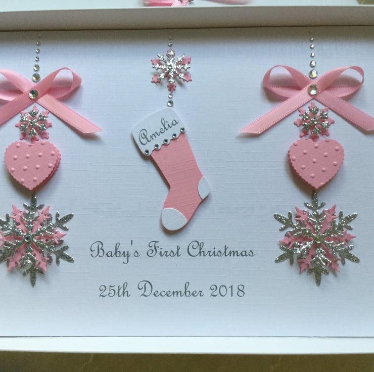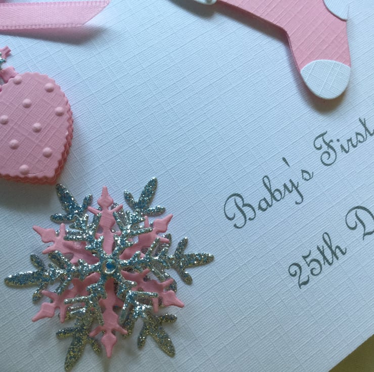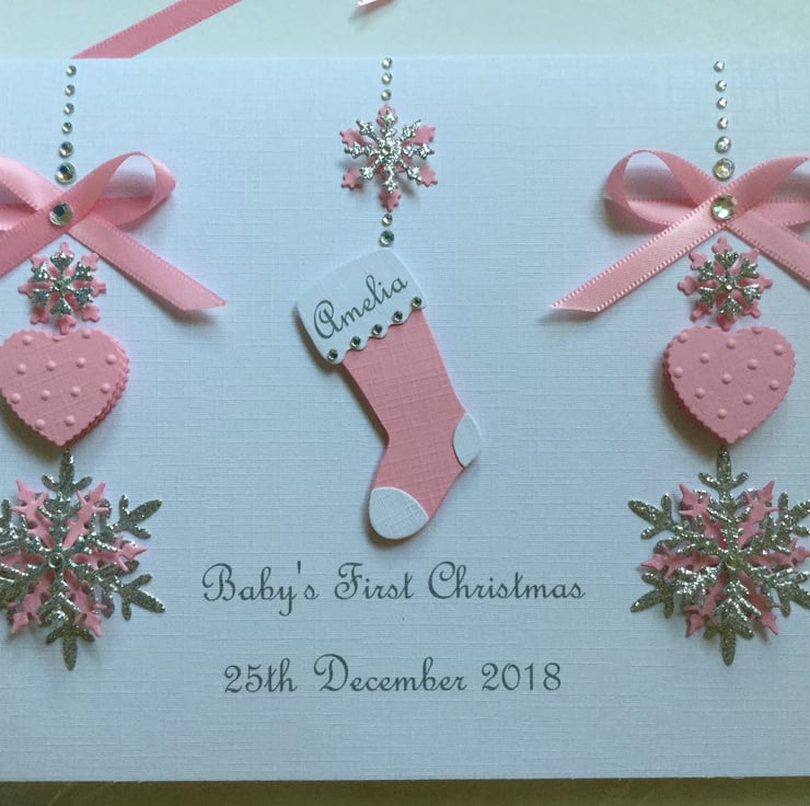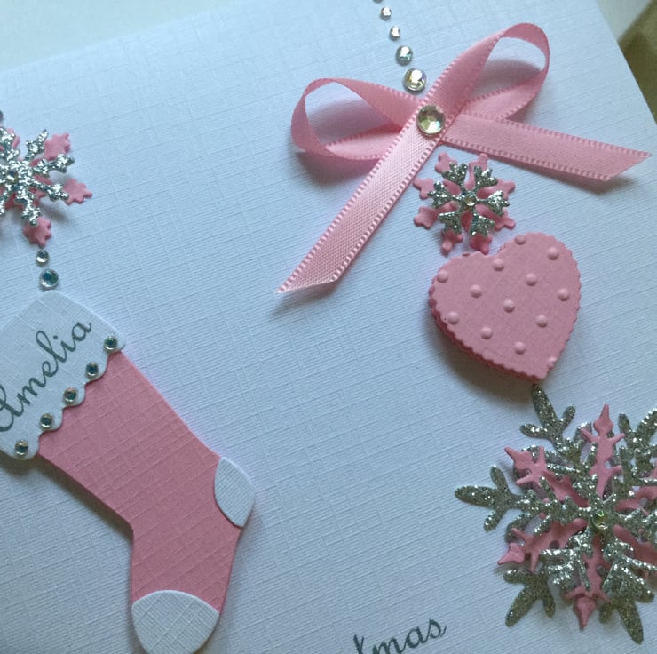 This handmade personalised Christmas card is A5 in size ( 210mm x 150mm) and is on 300gsm heavyweight linen card. This card is personalised with the name on the Christmas stocking along with the text of your choice underneath.