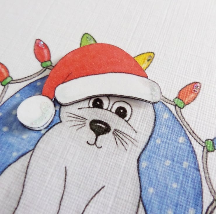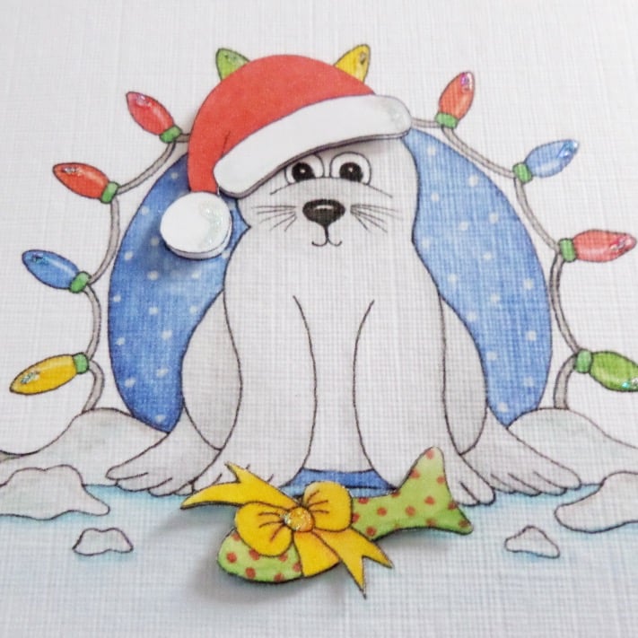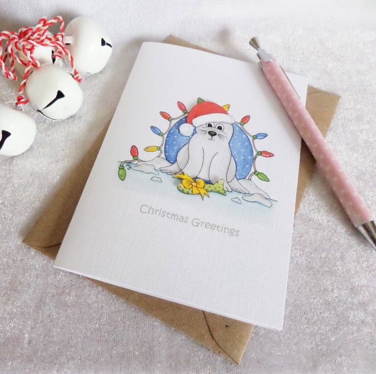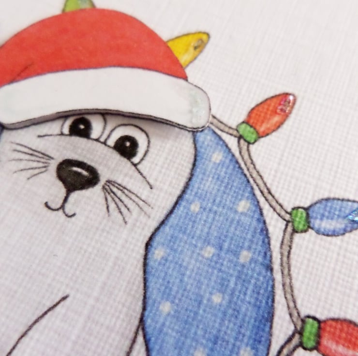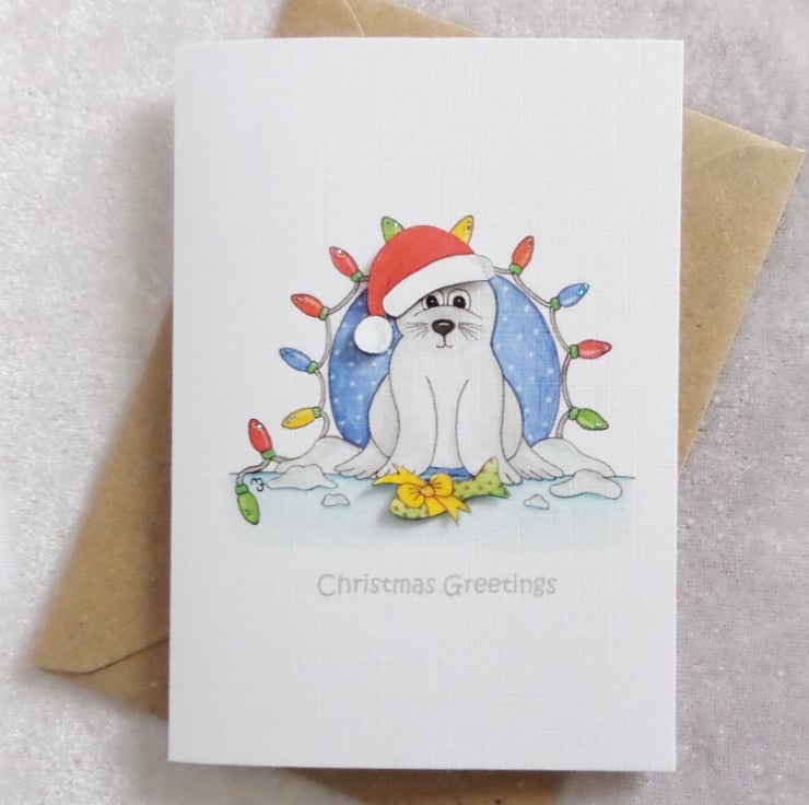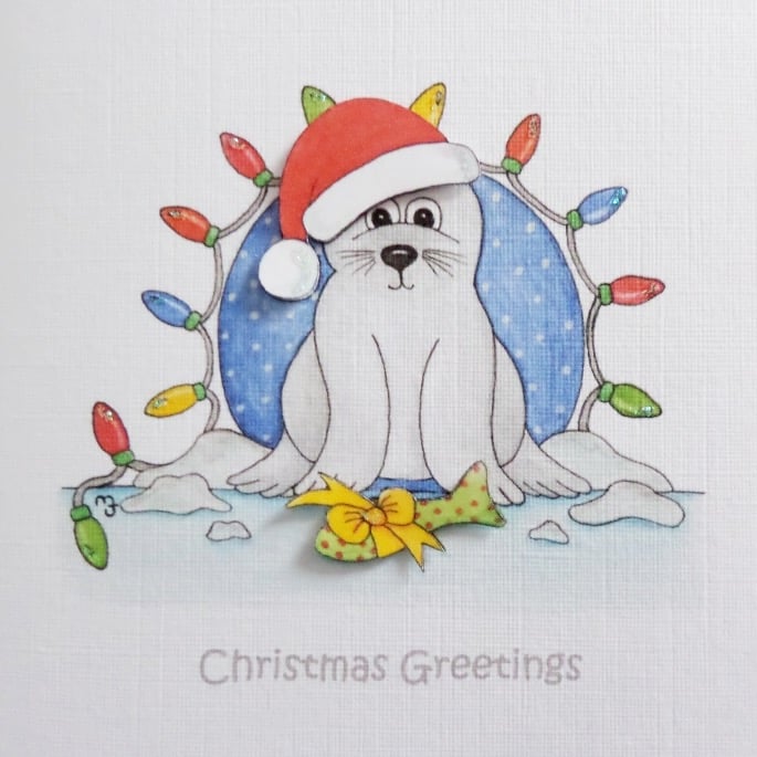 This cute Christmas Seal card has been designed using my own original watercolour illustration. The card has been printed out onto good quality linen embossed card. The little decoupaged gift and Santa hat have been cut out by hand and finished off with a little glitter detail.