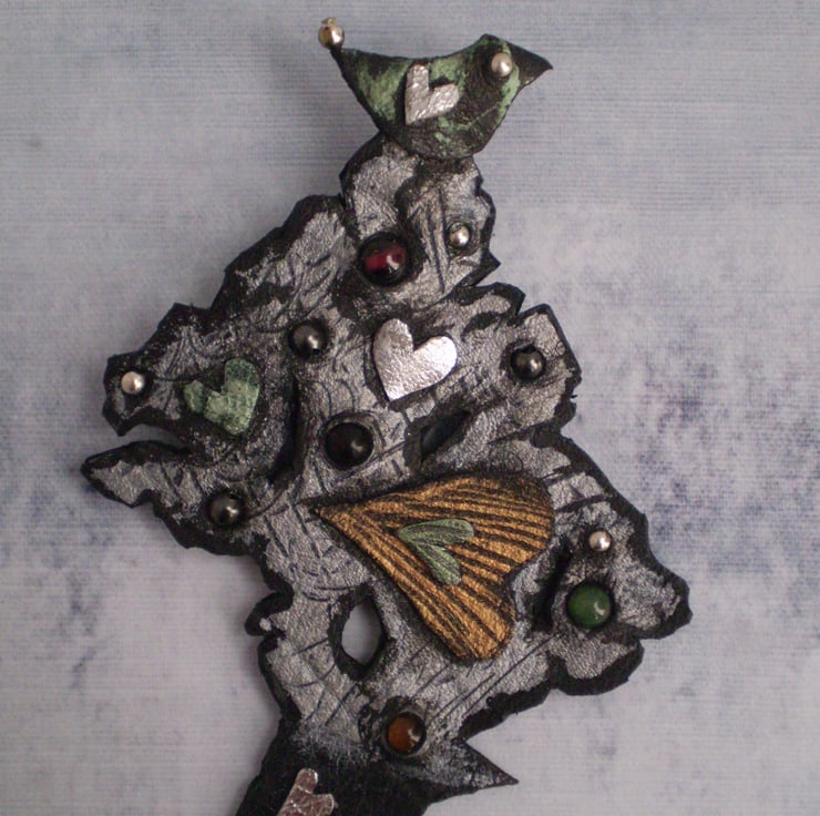 Hand cut from recycled black leather and hand painted in metalic acrylic paints.