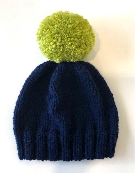 This listing is for a hand knitted navy blue bobble hat in chunky acrylic yarn with a large lime green pom pom.