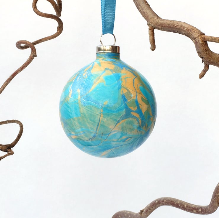 A decoration for those who like a twist on the traditional! This bold ceramic Christmas bauble has been marbled directly onto the surface in a palette of blue, turquoise and pale gold.