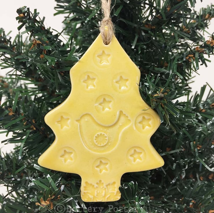 This highly decorative Christmas tree is made from white earthenware clay. It has been imprinted with a gorgeous bird and star pattern. It has been fired twice and finished with a rich, glossy glaze. The back is plain and unglazed. It measures 8cm x 6cm and hangs from a brown string