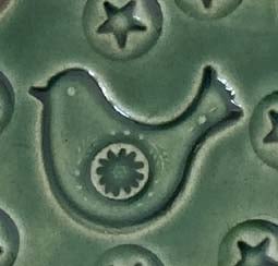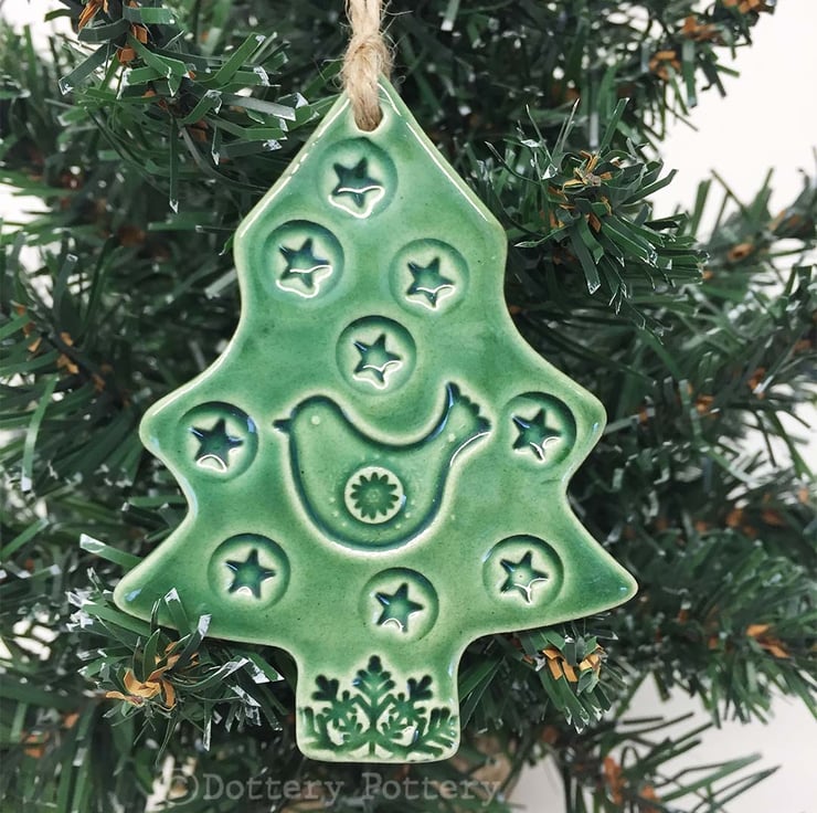 This highly decorative Christmas tree is made from white earthenware clay. It has been imprinted with a gorgeous bird and star pattern. It has been fired twice and finished with a rich, glossy glaze. The back is plain and unglazed. It measures 8cm x 6cm and hangs from a brown string