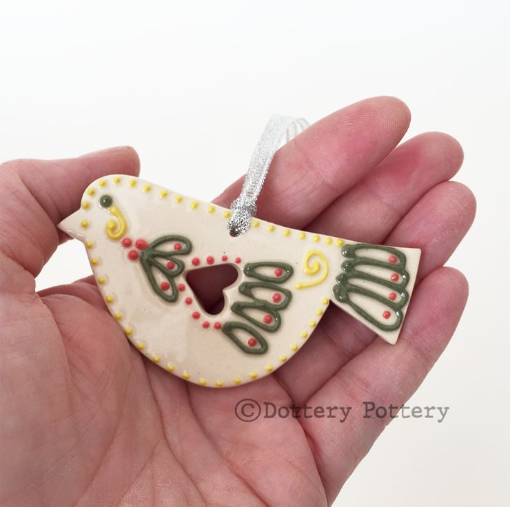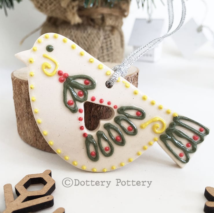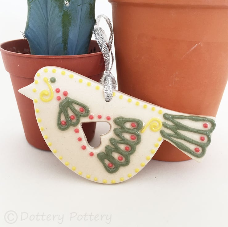 This cute little pottery robin has been hand-cut from a template that I designed myself. It is made from white earthenware clay, decorated and fired. It has then been glazed with a lovely glossy clear glaze and fired again to 1100 degrees. It hangs from a cream organza ribbon. 8cm wide x 4cm high x 0.8cm deep.