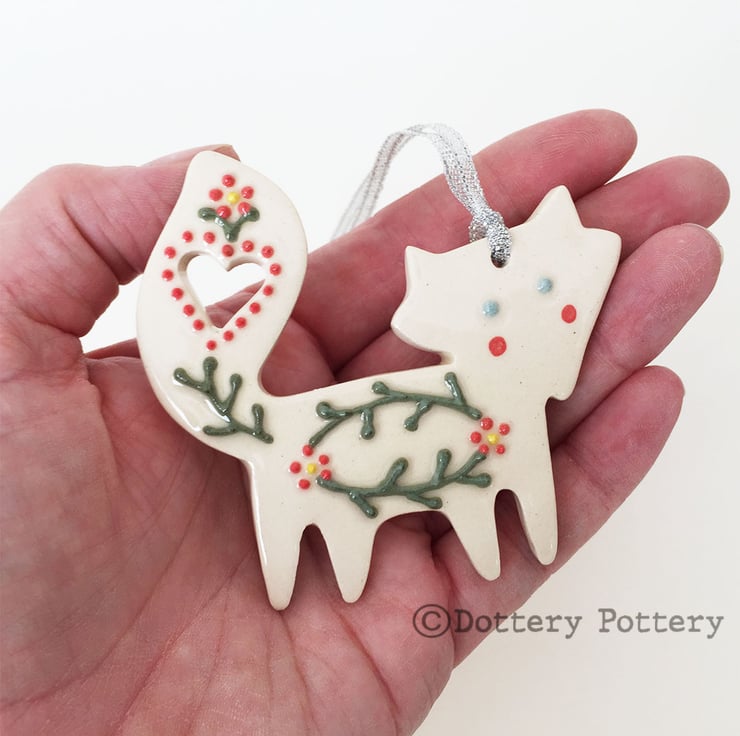 This cute little pottery fox has been hand-cut from white earthenware clay, decorated and fired. It has then been glazed with a lovely glossy clear glaze and fired again to 1100 degrees. It hangs from a cream organza ribbon. 8cm wide x 7cm high x 0.8cm deep.