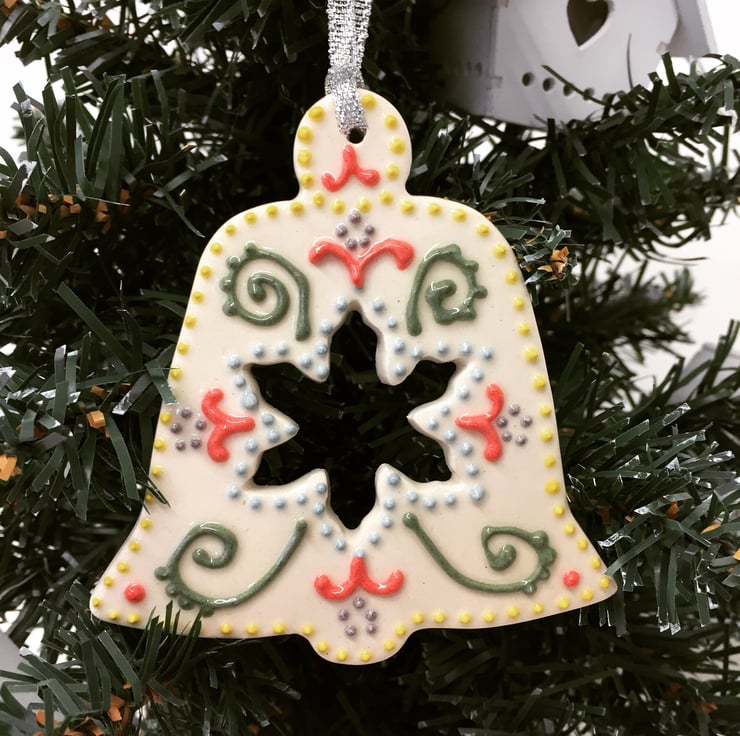This cute little pottery bell has been hand-cut from white earthenware clay, decorated and fired. It has then been glazed with a lovely glossy clear glaze and fired again to 1100 degrees. It hangs from a cream organza ribbon. 8cm wide x 8.5cm high x 0.8cm deep.