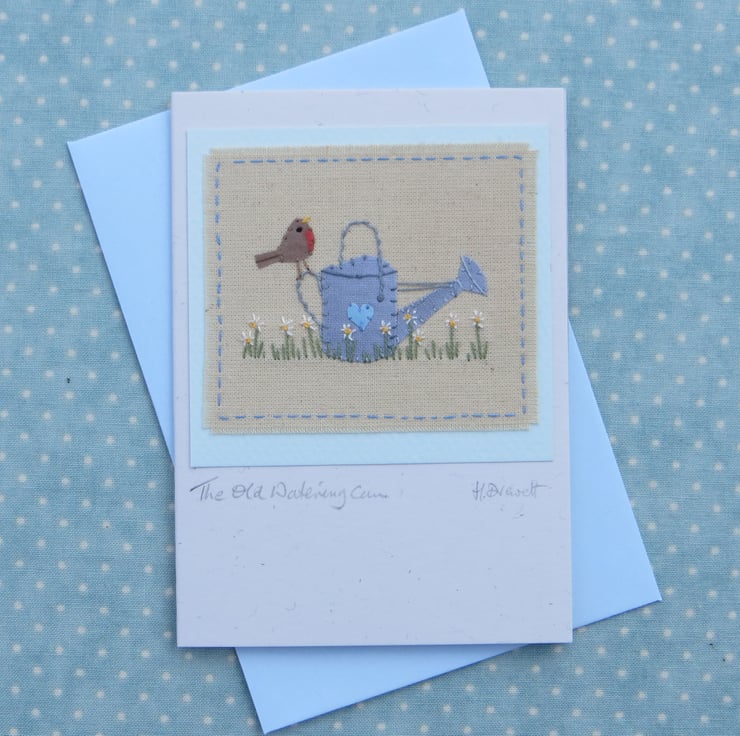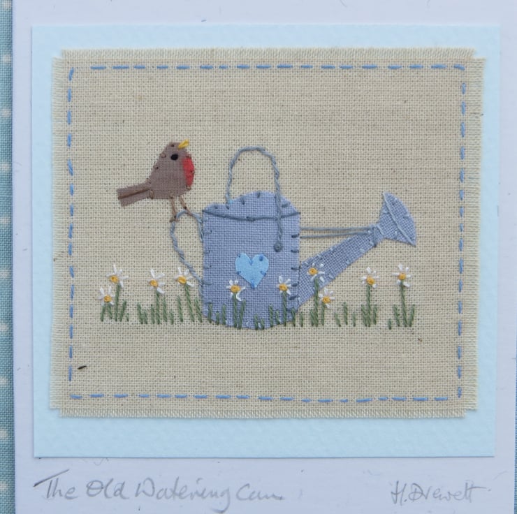 A hand-stitched textile miniature mounted onto greeting card, a gift in itself to keep (and frame?) as well as a card in which to write your message. I have cut the tiny applique watering can by hand and stitched it into position with the addition of embroidered details. A little robin perches on the handle and I have embroidered daisy flowers. I have used my own hand dyed recycled cottons to make this miniature textile.