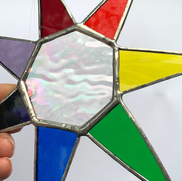 Made with beautifully coloured stained glass with irredised glass in the centre.