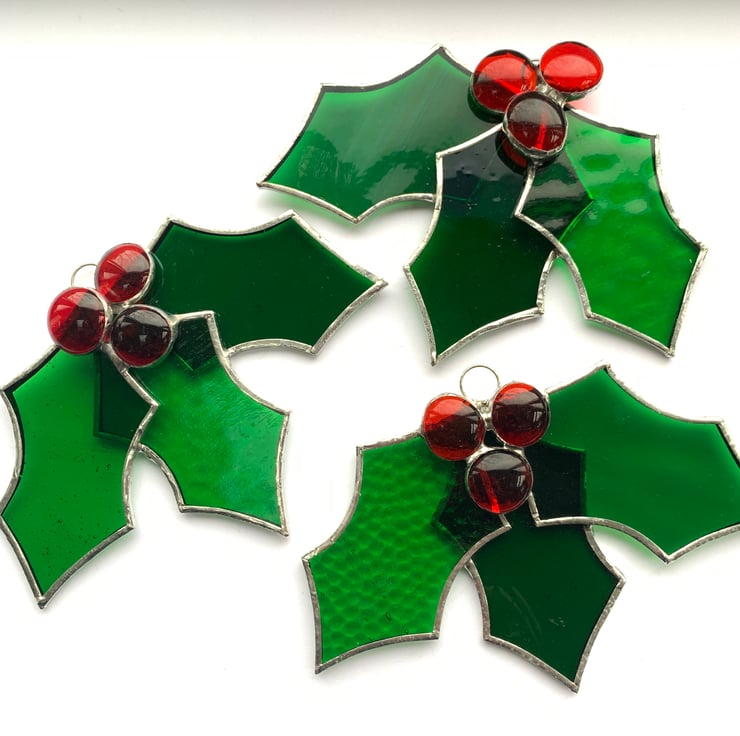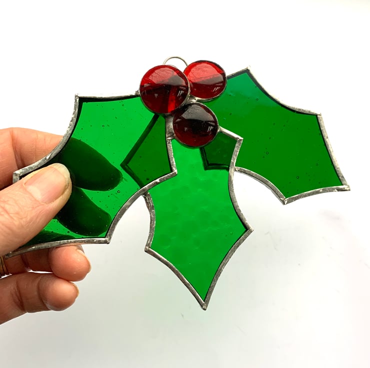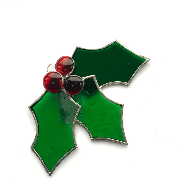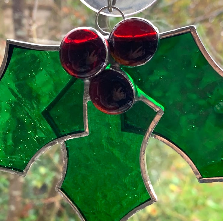 This suncatcher has been made from 3 types of green stained glass and 3 red nuggets for the berries.