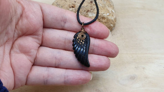 This is a unisex black Obsidian pendant necklace. Wire wrapped with antique brass coloured coated copper wire.