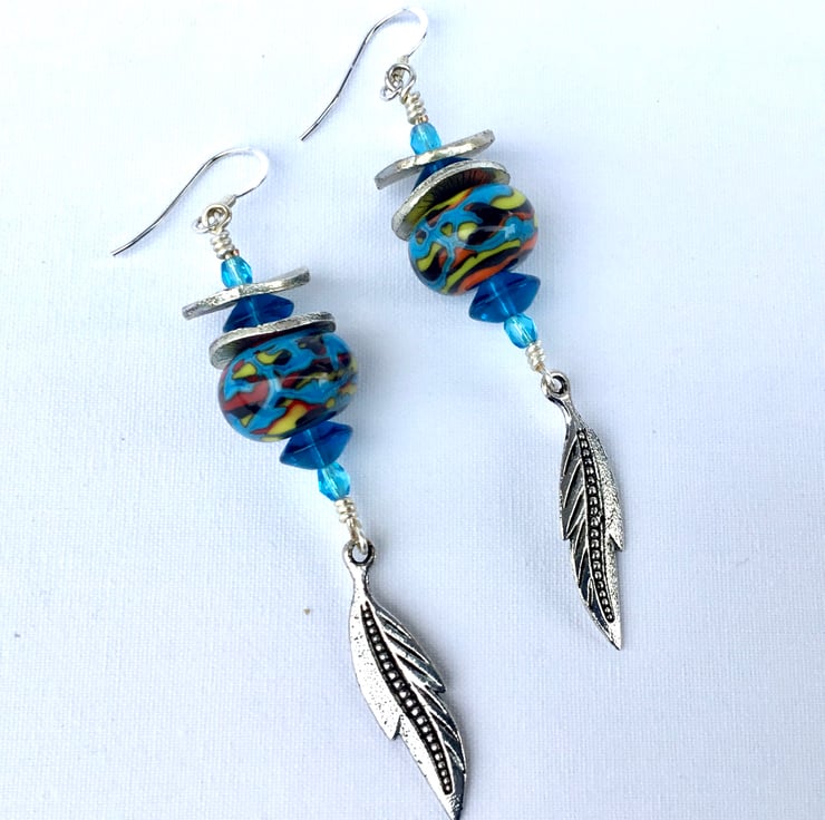 This design was conceived while walking along the river where I often pick up feathers which I use to paint with. These earrings have Sterling Silver ear hooks and are made with flame worked beads created by me. Tibetan silver pieces have been added together with a little sparkle. They measure 9cm from top of ear wire.