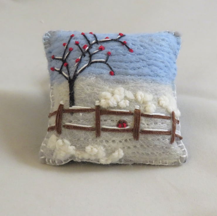 A pretty, felted and embroidered snowy winter design decorates this pincushion.