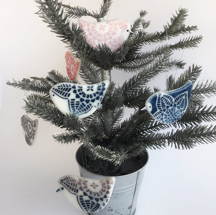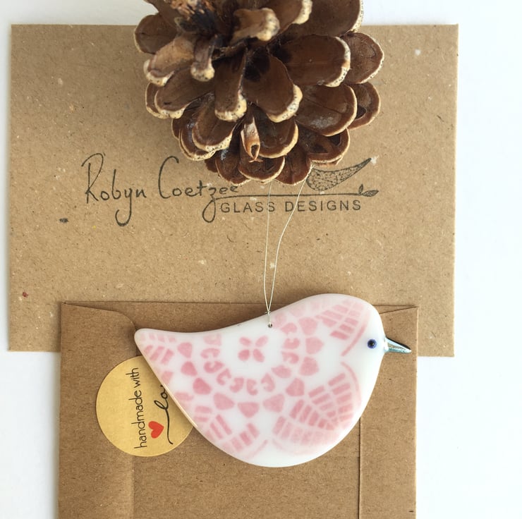 A small white glass bird with my signature design in pink and strung on a length of silver wire. It has a cute little silver beak. This little bird would be a lovely addition to your Christmas tree decoration collection.