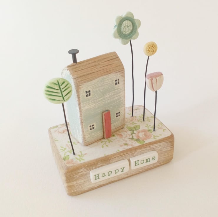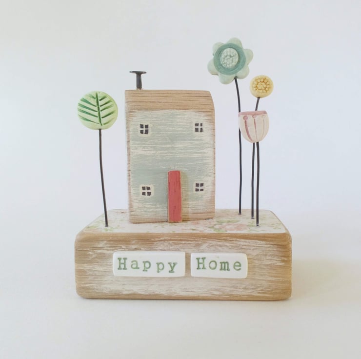 The flowers are hand moulded from polymer clay and fired and painted to finish as is the little sign which says 'Happy Home'