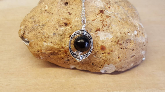 This is a small minimalist silver plated oval frame black tourmaline pendant necklace
