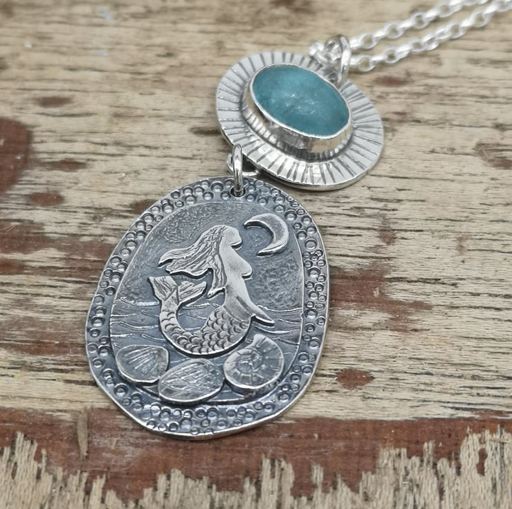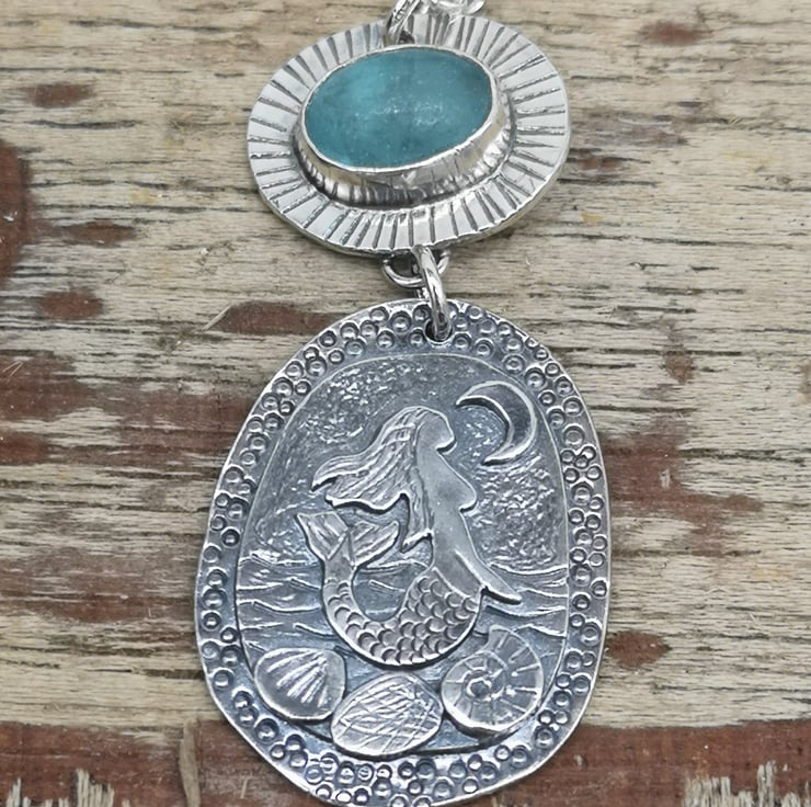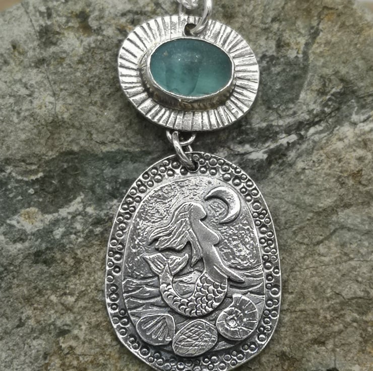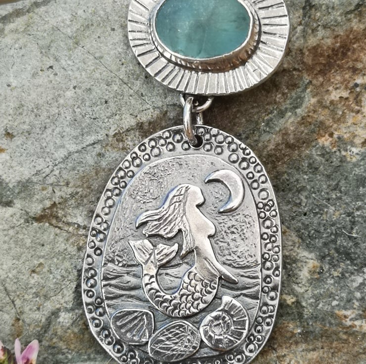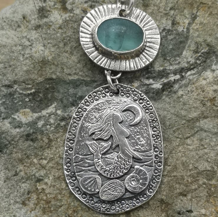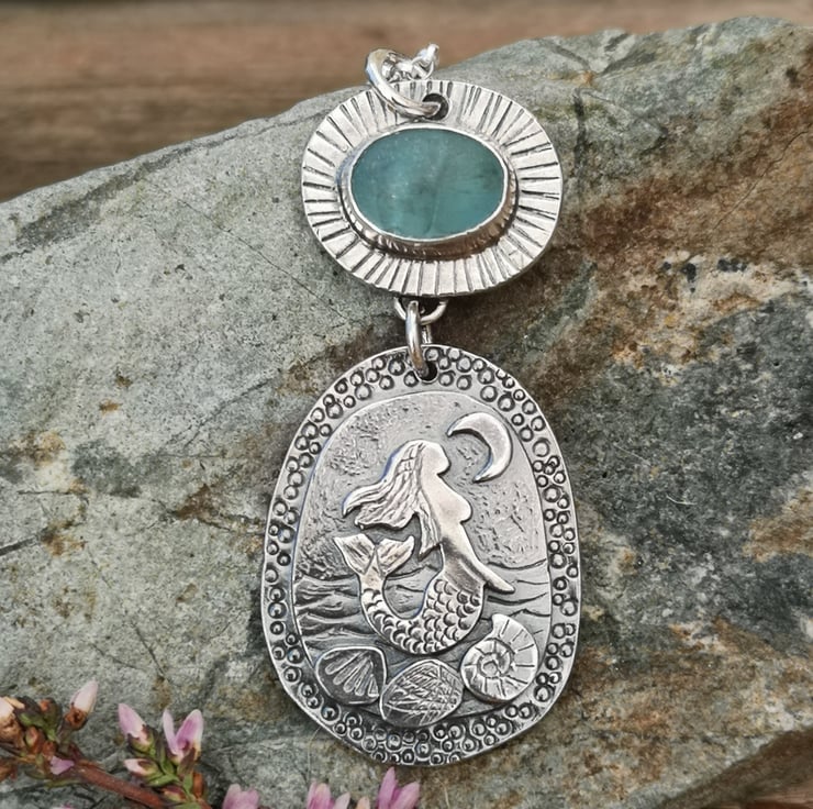 Using my jewellers saw I have pierced out my little mermaid and other components for this pendant, carefully soldering everything into place. The pendant is hammer textured and hand engraved with an oxidised finish and a lovely natural apatite stone which I have given a frosted finish reminiscent of sea glass.
