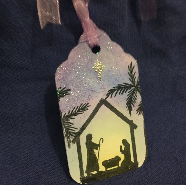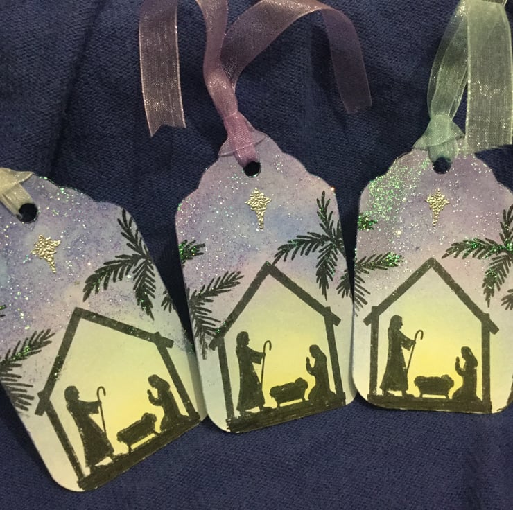 These beautiful handmade tags depicts the nativity with palm trees against a sparkling night sky and the shining star overhead are embellished with glitters, paints and organza ribbon.