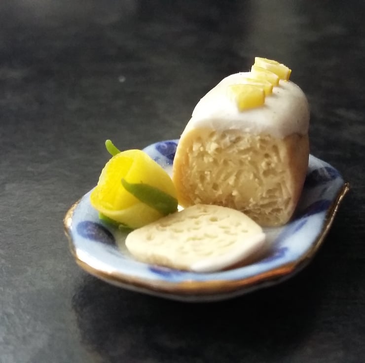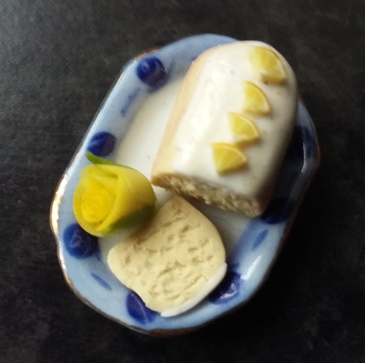 THIS IS A HAND SCULPTED 1;12TH SCALE LEMON DRIZZLE CAKE WITH A SLICE CUT. IT IS ICED AND DECORATED WITH LEMON SEGMENTS SERVED ON A BLUE AND WHITE CERAMIC PLATE WITH A LEMON ROSE