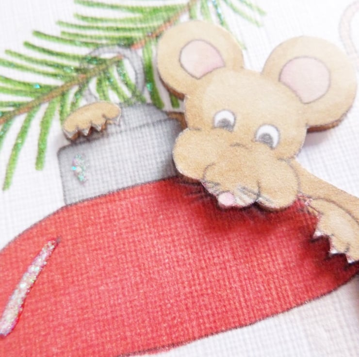 This cute Christmas Bauble Mouse card has been designed using my own original watercolour illustration. The card has been printed out onto good quality linen embossed card. The little decoupaged mouse has been cut out by hand and I have added a little glitter detail to the tree branch and bauble.