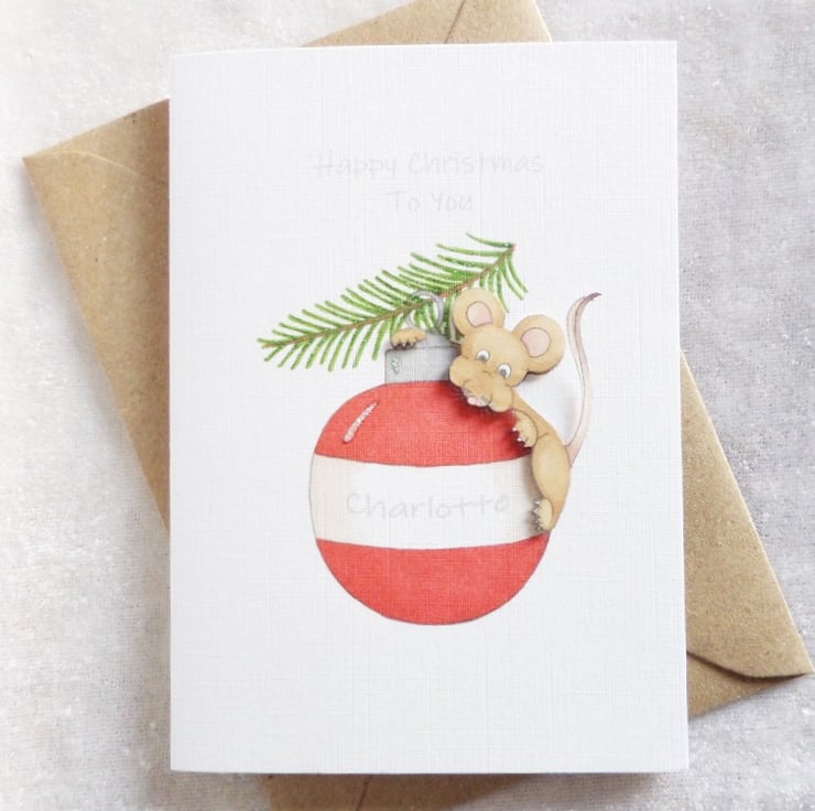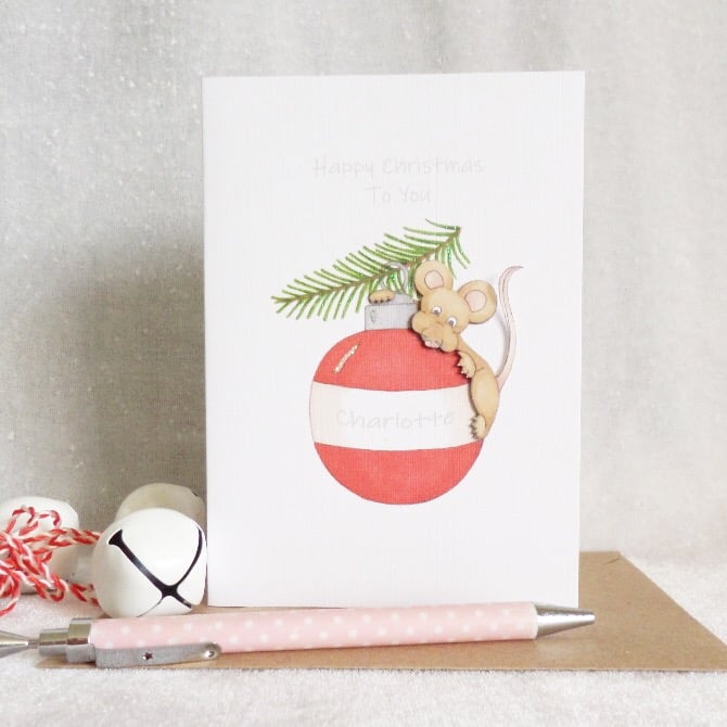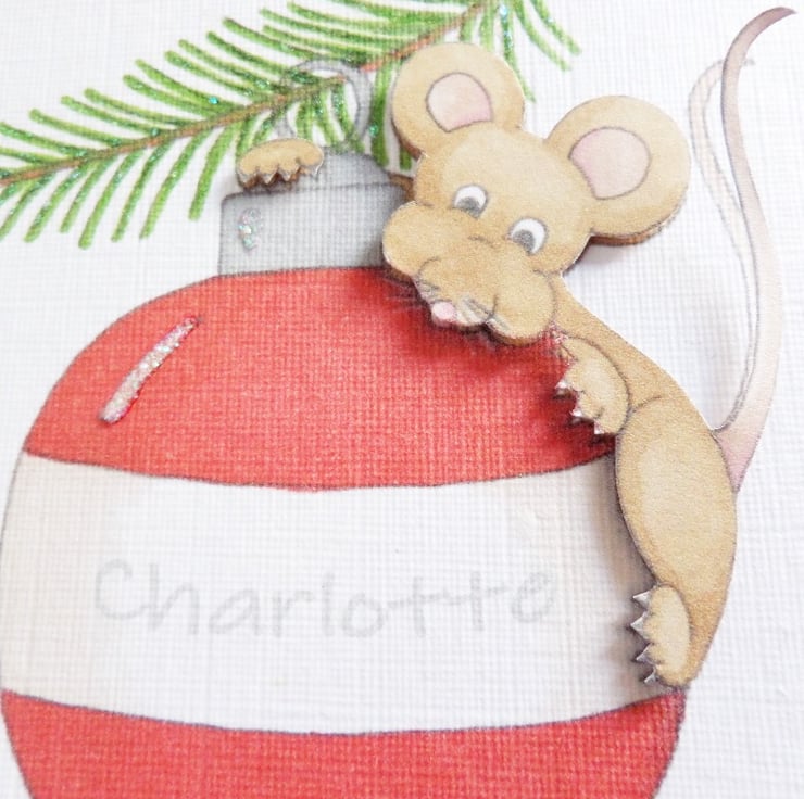 This cute Christmas Bauble Mouse card has been designed using my own original watercolour illustration. The card has been printed out onto good quality linen embossed card. The little decoupaged mouse has been cut out by hand and I have added a little glitter detail to the tree branch and bauble.