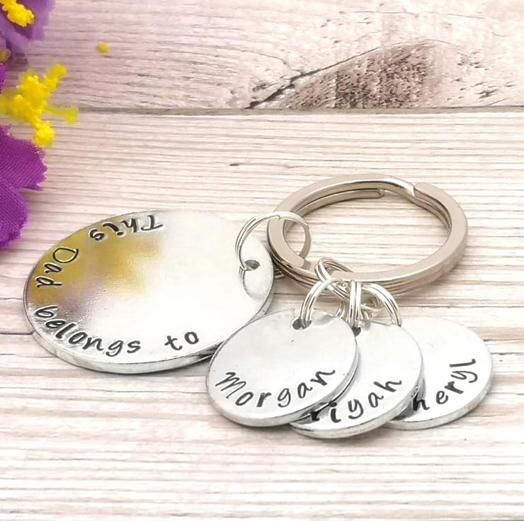 Personalise this keyring with your choice of wording on the larger disc, and personalised name charms. The perfect gift for a special Dad.