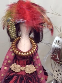 Meet Charlotte. She is a tilda type tall thin dolly of approximately 57cm and is made from tea dyed cotton. She looks very dashing in her burgundy coloured crinkle taffeta dress with gold polka dot cotton bodice and sleeves finished with a fabulous lush taffeta bow at the back. Her stockings are burgundy and gold polka dot cotton with black and white bows at her ankles. She really does think she looks very dapper, with her gold and burgundy spiral necklaces and multicoloured feather hat completing her outfit.